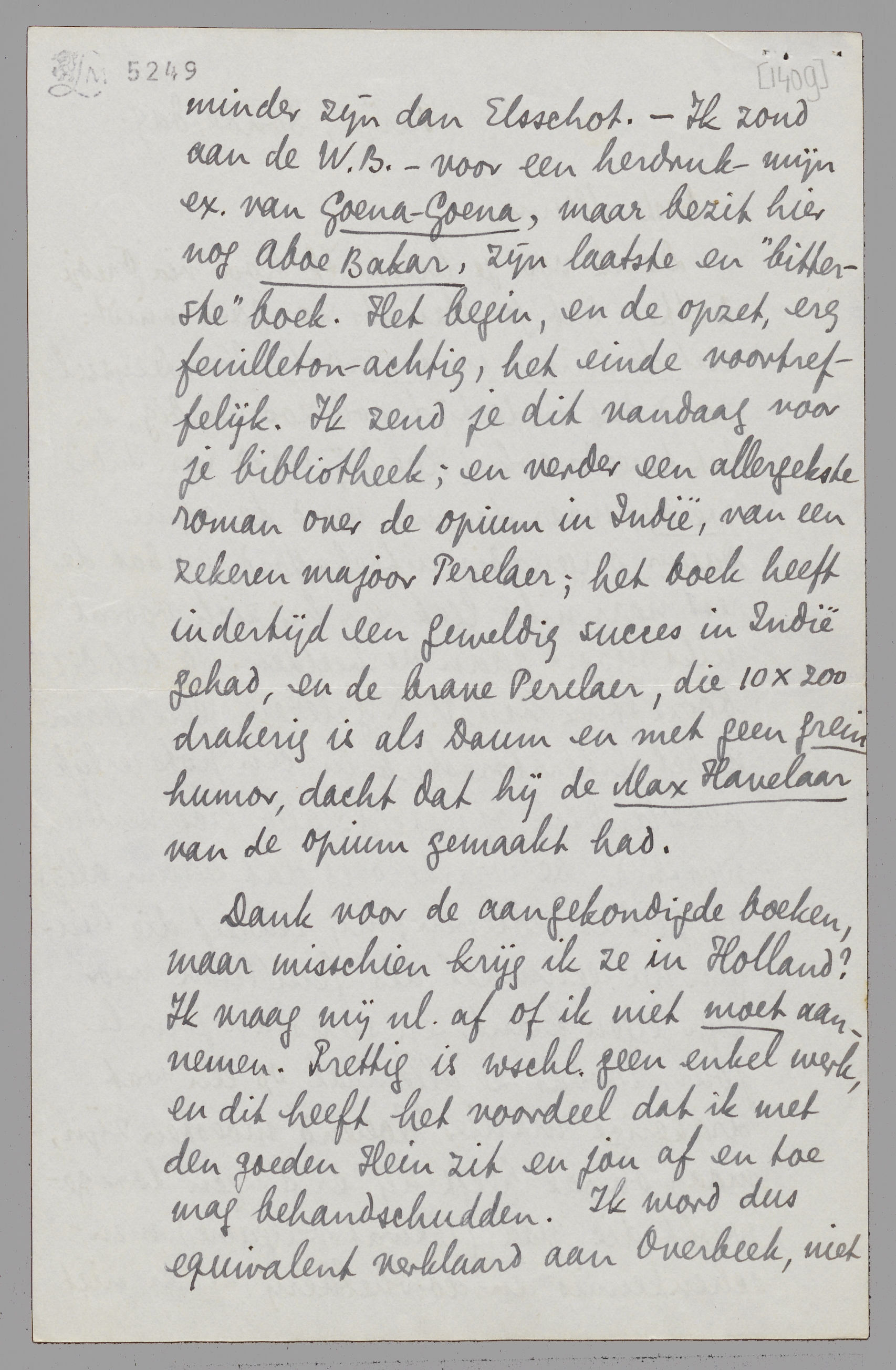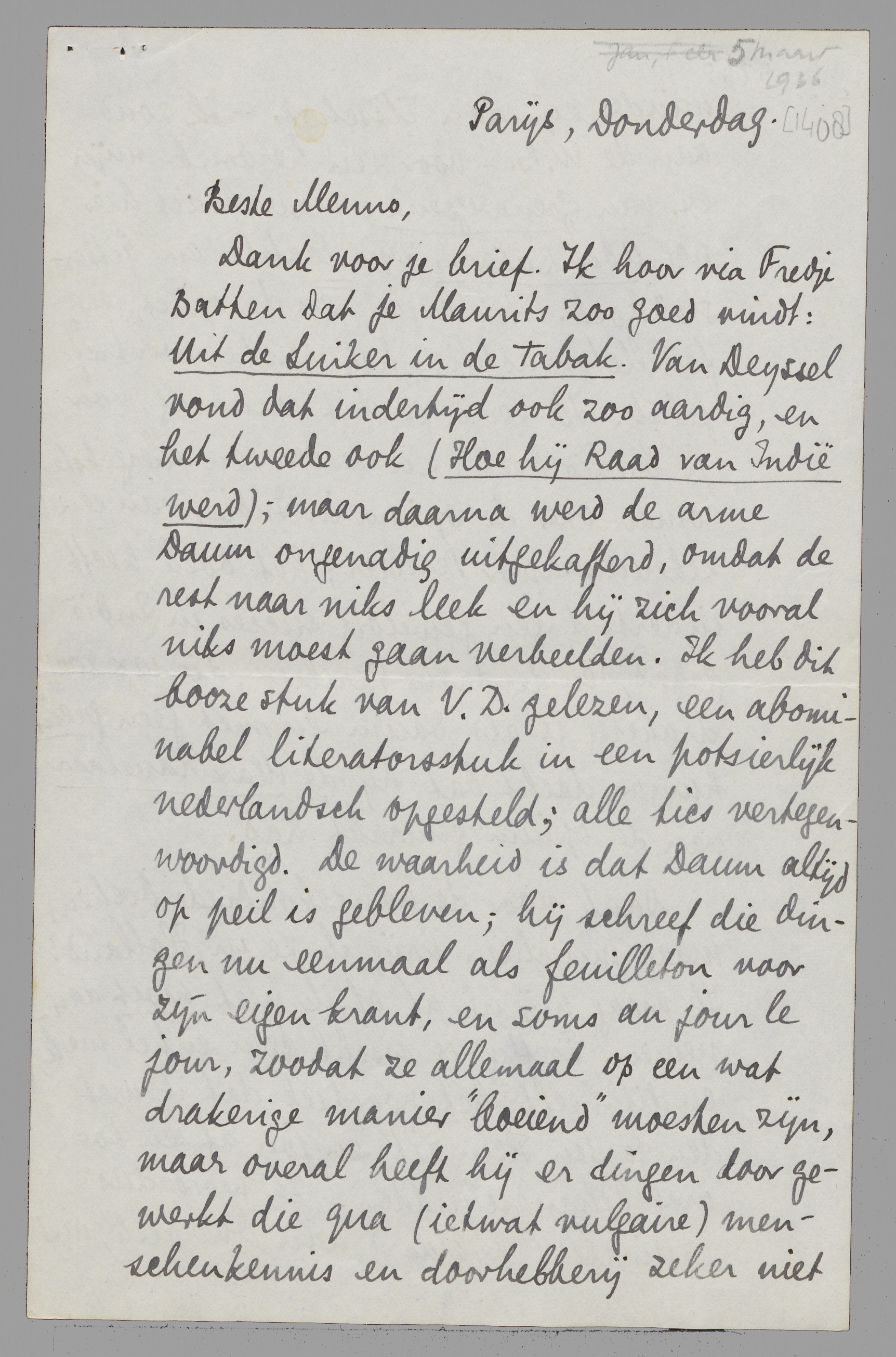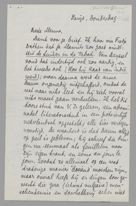 Dank voor je brief. Ik hoor via Fredje Batten dat je Maurits zoo goed vindt: Uit de Suiker in de Tabak. Van Deyssel vond dat indertijd ook zoo aardig, en het tweede ook (Hoe hij Raad van Indië werd); maar daarna werd de arme Daum ongenadig uitgekafferd, omdat de rest naar niks leek en hij zich vooral niks moest gaan verbeelden. Ik heb dit booze stuk van V.D. gelezen, een abominabel literatorsstuk in een potsierlijk nederlandsch opgesteld; alle tics vertegenwoordigd. De waarheid is dat Daum altijd op peil gebleven is; hij schreef die dingen nu eenmaal als feuilleton voor zijn eigen krant, en soms au jour le jour, zoodat ze allemaal op een wat drakerige manier ‘boeiend’ moesten zijn, maar overal heeft hij er dingen door gewerkt die qua (ietwat vulgaire) menschenkennis en doorhebberij zeker niet minder zijn dan Elsschot. - Ik zond aan de W.B. - voor een herdruk - mijn ex. van Goena-Goena, maar bezit hier nog Aboe Bakar, zijn laatste en ‘bitterste’ boek. Het begin, en de opzet, erg feuilleton-achtig, het einde voortreffelijk. Ik zend je dit vandaag voor je bibliotheek; en verder een allergekste roman over de opium in Indië, van een zekeren majoor Perelaer; het boek heeft indertijd een geweldig succes in Indië gehad, en de brave Perelaer, die 10 × zoo drakerig is als Daum en met geen grein humor, dacht dat hij de Max Havelaar van de opium gemaakt had.