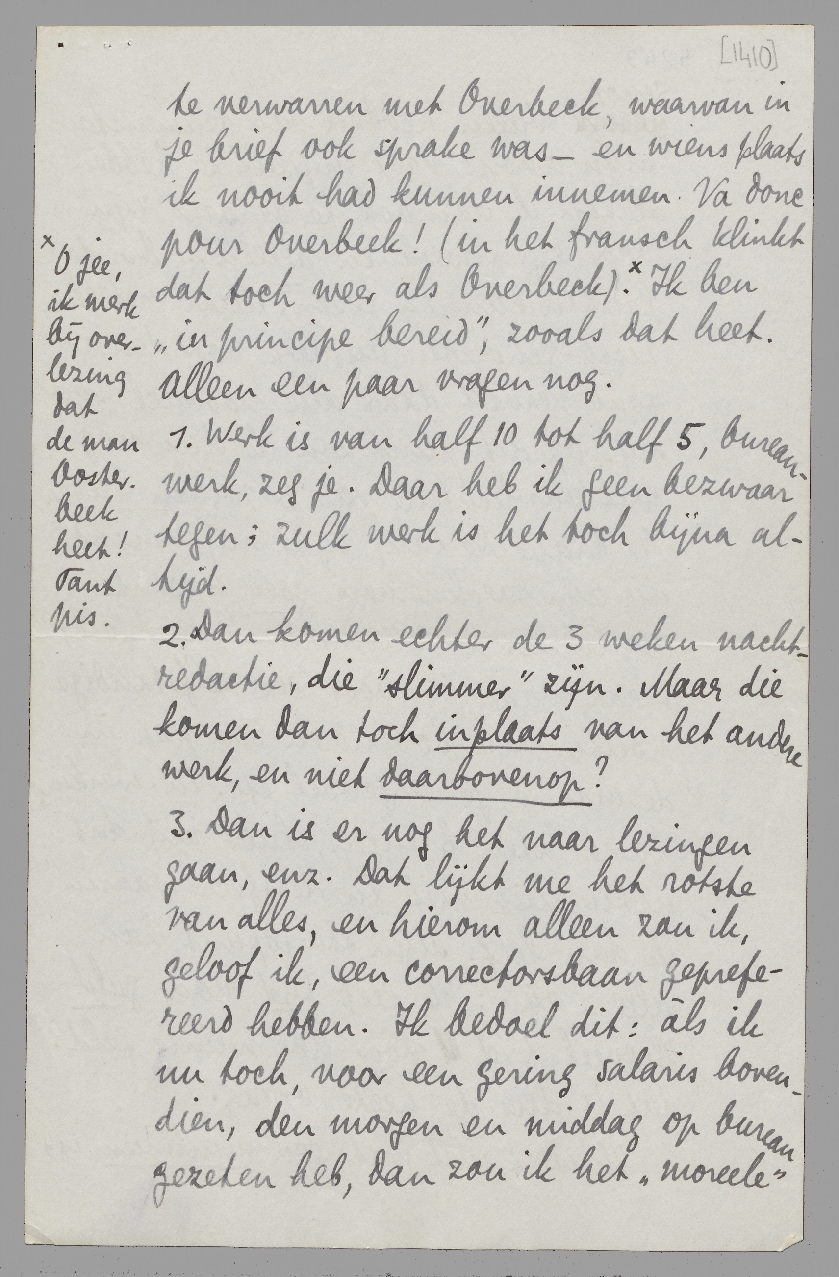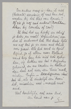 Dank voor de aangekondigde boeken, maar misschien krijg ik ze in Holland? Ik vraag mij nl. af of ik niet moet aannemen. Prettig is wschl. geen enkel werk, en dit heeft het voordeel dat ik met den goeden Hein zit en jou af en toe mag behandschudden. Ik word dus equivalent verklaard aan Overbeek, niet te verwarren met Overbeck, waarvan in je brief ook sprake was - en wiens plaats ik nooit had kunnen innemen. Va donc pour Overbeek! (in het fransch klinkt dat toch weer als Overbeck). [O jee, ik merk bij overlezing dat de man Oosterbeek heet! Tant pis.] Ik ben ‘in principe bereid’, zooals dat heet. Alleen een paar vragen nog.
