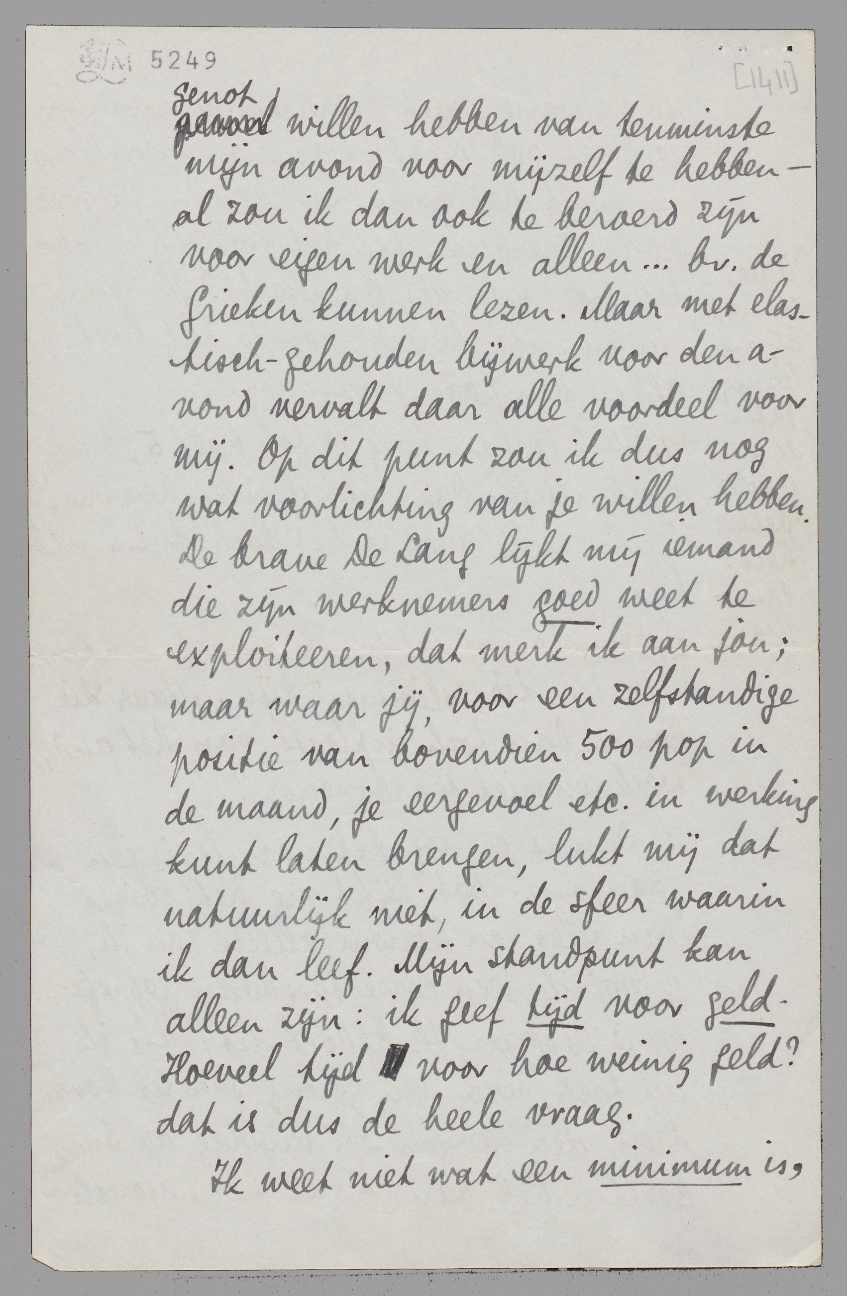 3. Dan is er nog het naar lezingen gaan, enz. Dat lijkt me het rotste van alles, en hierom alleen zou ik, geloof ik, een correctorsbaan geprefereerd hebben. Ik bedoel dit: àls ik nu toch, voor een gering salaris bovendien, den morgen en middag op bureau gezeten heb, dan zou ik het ‘moreele’ genot willen hebben van tenminste mijn avond voor mijzelf te hebben - al zou ik dan ook te beroerd zijn voor eigen werk en alleen... b.v. de Grieken kunnen lezen. Maar met elastisch-gehouden bijwerk voor den avond vervalt daar alle voordeel voor mij. Op dit punt zou ik dus nog wat voorlichting van je willen hebben. De brave De Lang lijkt mij iemand die zijn werknemers goed weet te exploiteeren, dat merk ik aan jou; maar waar jij, voor een zelfstandige positie van bovendien 500 pop in de maand, je eergevoel etc. in werking kunt laten brengen, lukt mij dat natuurlijk niet, in de sfeer waarin ik dan leef. Mijn standpunt kan alleen zijn: ik geef tijd voor geld. Hoeveel tijd voor hoe weinig geld? dat is dus de heele vraag.