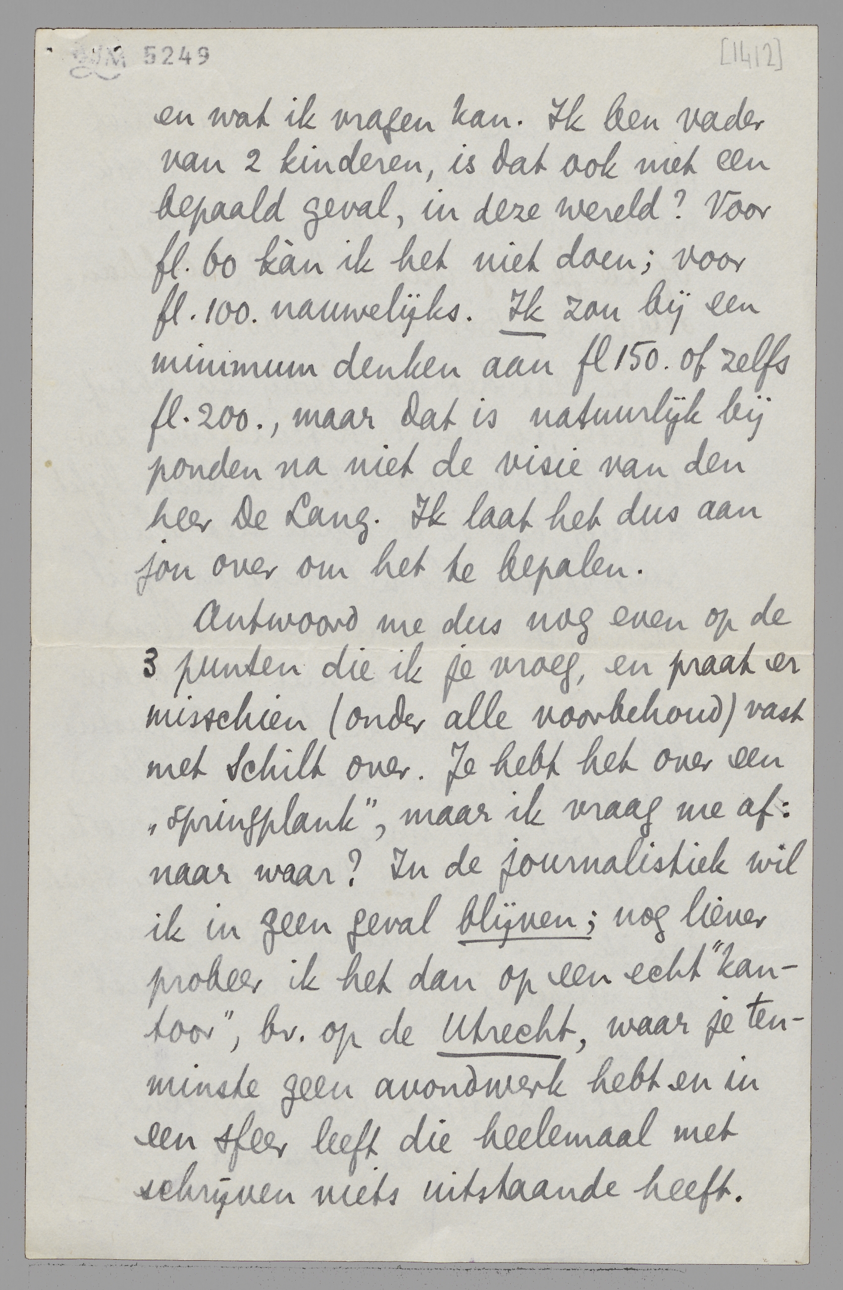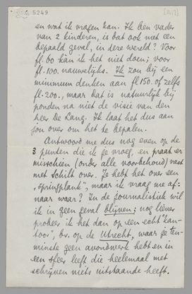 Ik weet niet wat een minimum is, en wat ik vragen kan. Ik ben vader van 2 kinderen, is dat ook niet een bepaald geval, in deze wereld? Voor fl. 60 kàn ik het niet doen; voor fl. 100. nauwelijks. Ik zou bij een minimum denken aan fl. 150. of zelfs fl. 200., maar dat is natuurlijk bij ponden na niet de visie van den heer De L̄ang. Ik laat het dus aan jou over om het te bepalen.