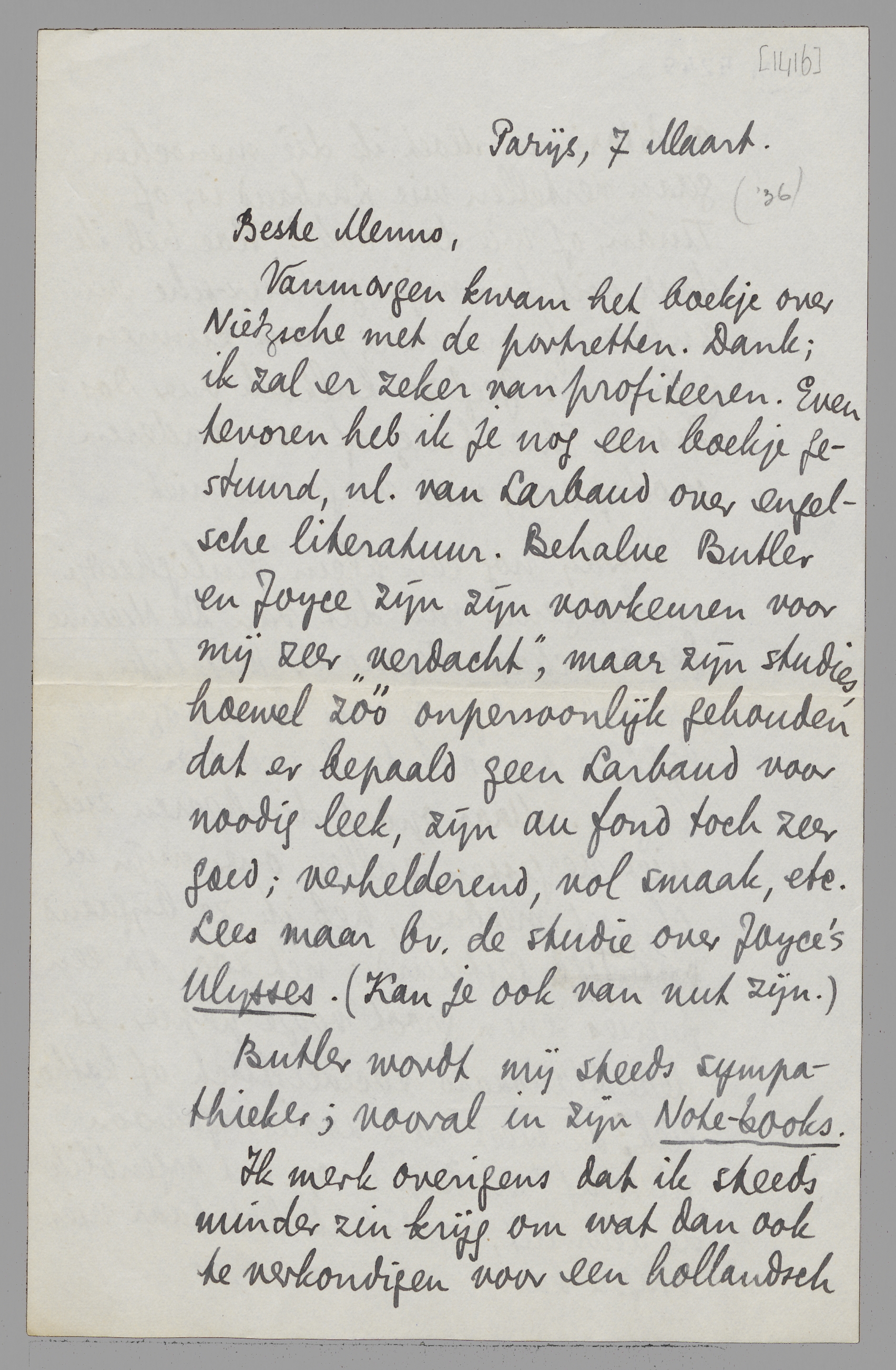 Vanmorgen kwam het boekje over Nietzsche met de portretten. Dank; ik zal er zeker van profiteeren. Even tevoren heb ik je nog een boekje gestuurd, nl. van Larbaud over engelsche literatuur. Behalve Butler en Joyce zijn zijn voorkeuren voor mij zeer ‘verdacht’, maar zijn studies, hoewel zóó onpersoonlijk gehouden dat er bepaald geen Larbaud voor noodig leek, zijn au fond toch zeer goed; verhelderend, vol smaak, etc. Lees maar bv. de studie over Joyce's Ulysses. (Kan je ook van nut zijn.)
