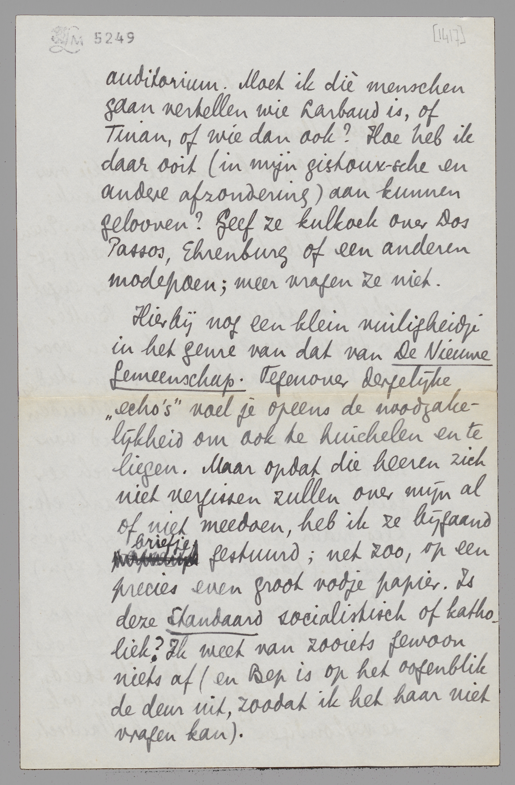 Hierbij nog een klein vuiligheidje in het genre van dat van De Nieuwe Gemeenschap. Tegenover dergelijke ‘echo's’ voel je opeens de noodzakelijkheid om ook te huichelen en te liegen. Maar opdat die heeren zich niet vergissen zullen over mijn al of niet meedoen, heb ik ze bijgaand briefje gestuurd; net zoo, op een precies even groot vodje papier. Is deze Standaard socialistisch of katholiek? Ik weet van zooiets gewoon niets af (en Bep is op het oogenblik de deur uit, zoodat ik het haar niet vragen kan).