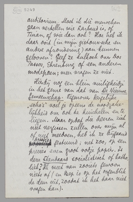 Ik merk overigens dat ik steeds minder zin krijg om wat dan ook te verkondigen voor een hollandsch auditorium. Moet ik diè menschen gaan vertellen wie Larbaud is, of Tinan, of wie dan ook? Hoe heb ik daar ooit (in mijn gistoux-sche en andere afzondering) aan kunnen gelooven? Geef ze kulkoek over Dos Passos, Ehrenburg of een anderen modepoen; meer vragen ze niet.