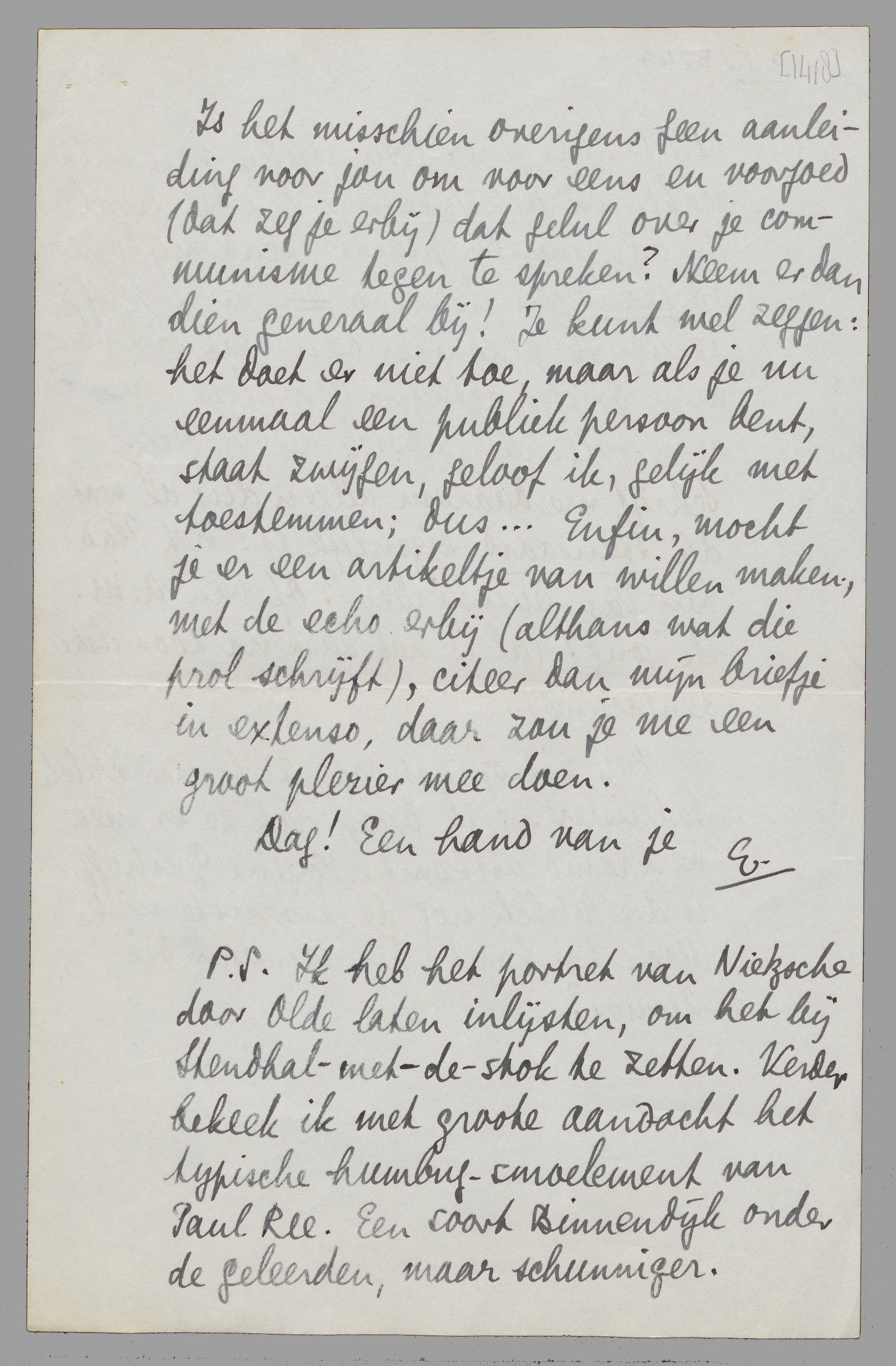 P.S. Ik heb het portret van Nietzsche door Olde laten inlijsten, om het bij Stendhal-met-de-stok te zetten. Verder bekeek ik met groote aandacht het typische humbugsmoelement van Paul Ree. Een soort Binnendijk onder de geleerden, maar schunniger.
