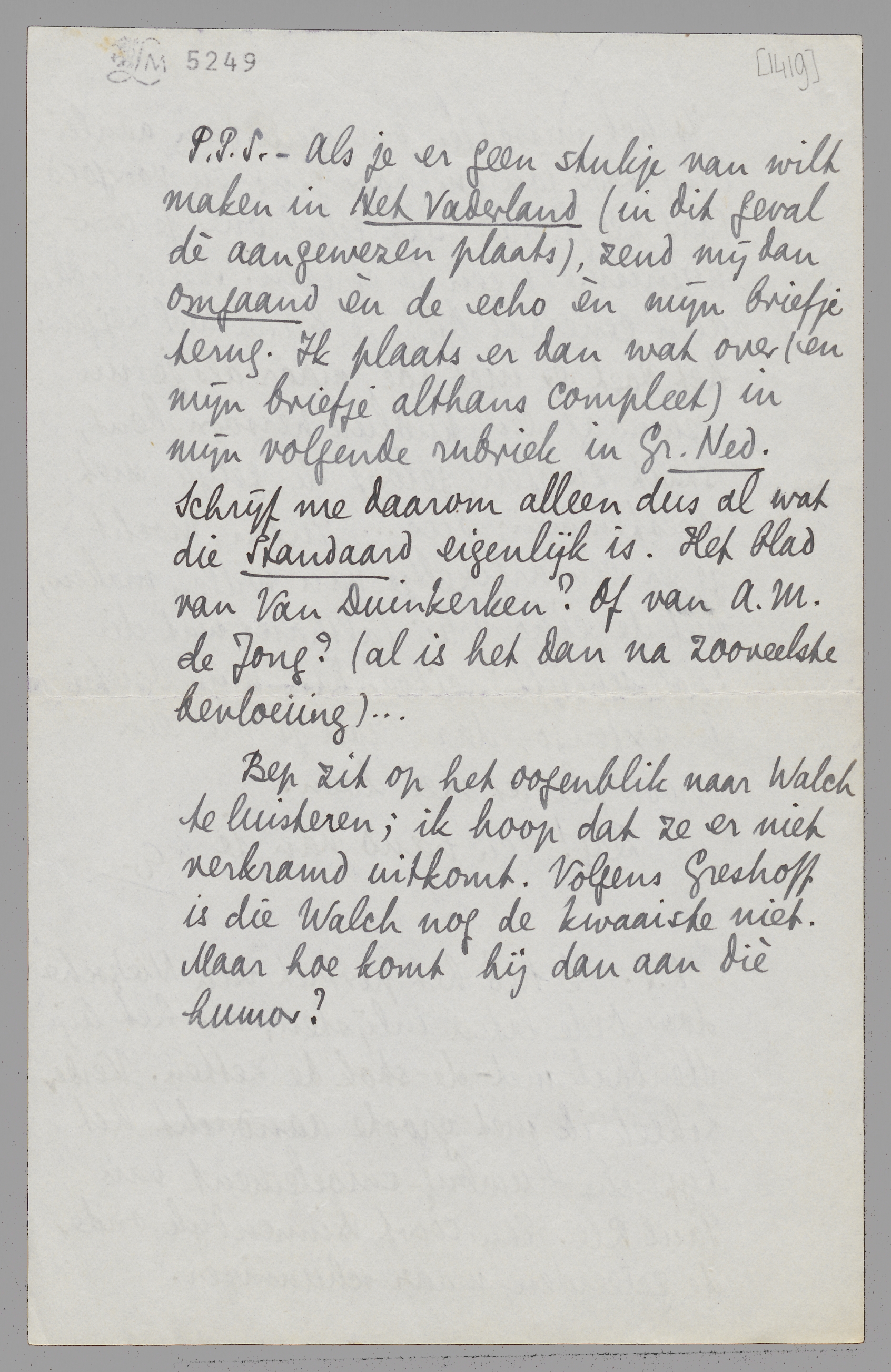 P.P.S. - Als je er geen stukje van wilt maken in Het Vaderland (in dit geval dè aangewezen plaats,) zend mij dan omgaand èn de echo èn mijn briefje terug. Ik plaats er dan wat over (en mijn briefje althans compleet) in mijn volgende rubriek in Gr. Ned. Schrijf me daarom alleen dus al wat die Standaard eigenlijk is. Het blad van Van Duinkerken? Of van A.M. de Jong? (al is het dan na zooveelste bevloeiing)...