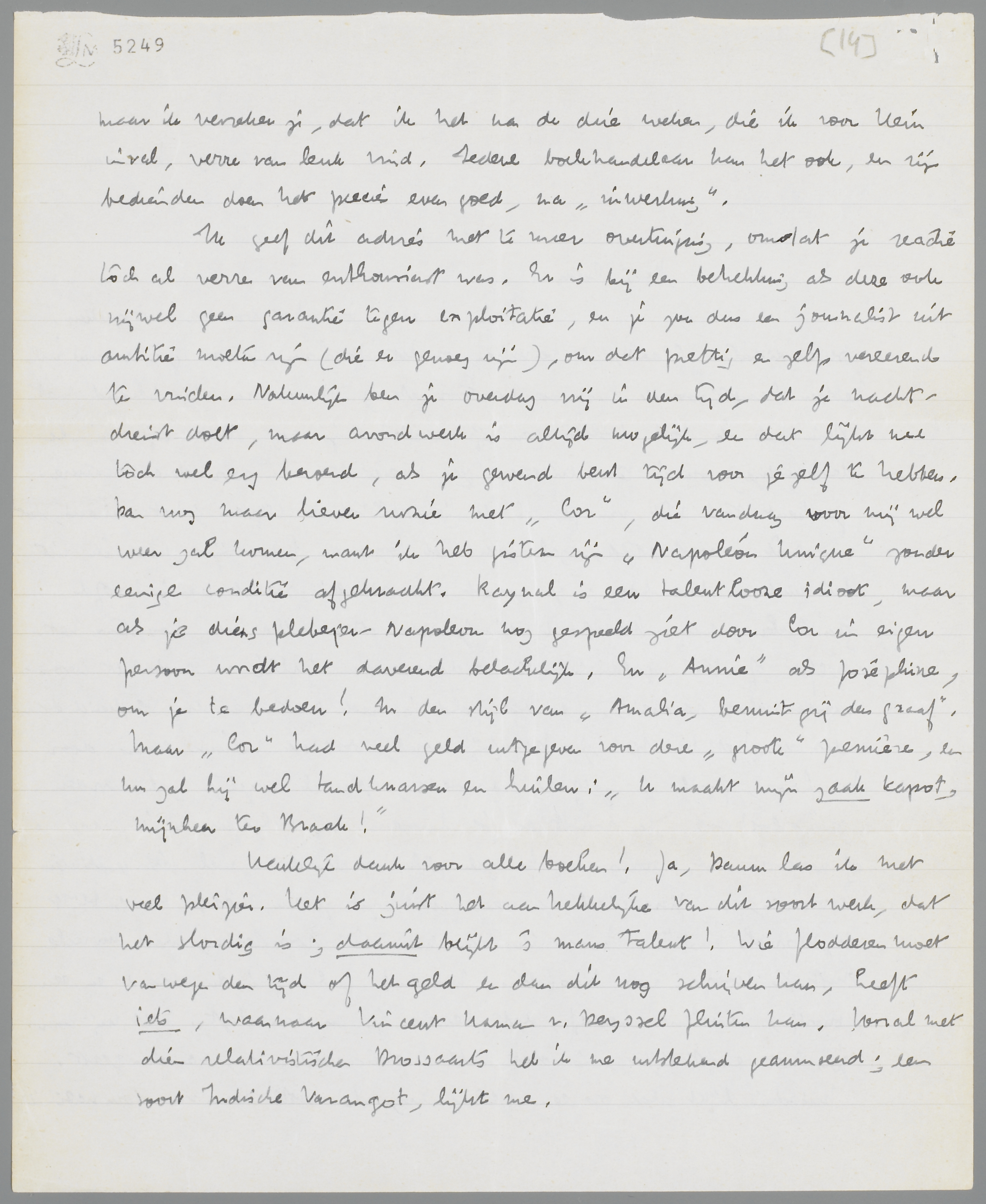Ik geef dit advies met te meer overtuiging, omdat je reactie toch al verre van enthousiast was. Er is bij een betrekking als deze ook vrijwel geen garantie tegen exploitatie, en je zou dus een journalist uit ambitie moeten zijn (die er genoeg zijn), om dat prettig en zelfs vereerend te vinden. Natuurlijk ben je overdag vrij in den tijd, dat je nachtdienst doet, maar avondwerk is altijd mogelijk, en dat lijkt me toch wel erg beroerd, als je gewend bent tijd voor je zelf te hebben. Dan nog maar liever ruzie met ‘Cor’, die vandaag voor mij wel weer zal komen, want ik heb gisteren zijn Napoléon Unique zonder eenige conditie afgekraakt. Raynal is een talentlooze idioot, maar als je diens plebejer Napoleon nog gespeeld ziet door Cor in eigen persoon wordt het daverend belachelijk. En ‘Annie’ als Joséphine, om je te bedoen! In den stijl van ‘Amalia, bemint gij den graaf’. Maar ‘Cor’ had veel geld uitgegeven voor deze ‘groote’ première, en nu zal hij wel tandknarsen en huilen: ‘U maakt mijn zaak kapot, mijnheer ter Braak!’