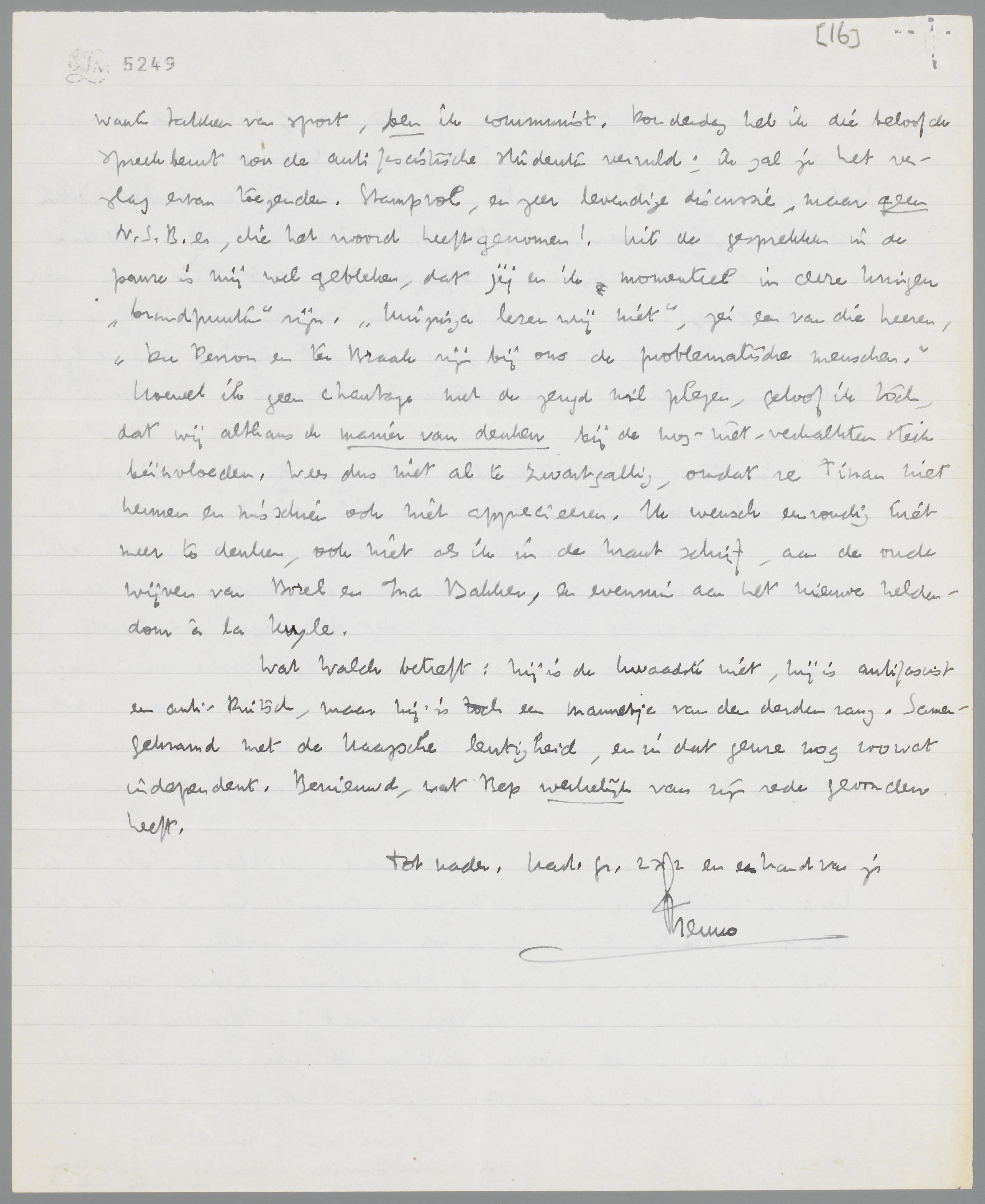 Het gevalletje uit De Standaard (het blad van Colijn d.w.z. van zijn fractie, de anti-revolutionnairen; vroeger was Kuyper daar de groote man in.) teekent de politieke gristenen. Ik vind het aardig van je, dat je er even op reageerde (Ant werd er ook spontaan woedend over), maar ik krijg tegenover te veel van die verdachtmakingen onder oogen om er speciaal tegen te gaan protesteeren. Sedert ik begonnen ben zoo nu en dan eens te laten merken, dat ik het marxisme in den strijd tegen het fascisme niet zoo stom vind als het christendom en aanverwante takken van sport, ben ik communist. Donderdag heb ik die beloofde spreekbeurt van de antifascistische studenten vervuld; ik zal je het verslag ervan toezenden. Stampvol, en zeer levendige discussie, maar geen N.S.B.-er, die het woord heeft genomen! Uit de gesprekken in de pauze is mij wel gebleken, dat jij en ik momenteel in deze kringen ‘brandpunten’ zijn. ‘Huizinga lezen wij niet’, zei een van die heeren, ‘du Perron en ter Braak zijn bij ons de problematische menschen’. Hoewel ik geen chantage met de jeugd wil plegen, geloof ik toch, dat wij althans de manier van denken bij de nog-niet-verkalkten sterk beïnvloeden, wees dus niet al te zwartgallig, omdat ze Tinan niet kennen en misschien ook niet apprecieeren. Ik wensch eenvoudig niet meer te denken, ook niet als ik in de krant schrijf, aan de oude wijven van Borel en Ina Bakker, en evenmin aan het nieuwe heldendom à la Kuyle.