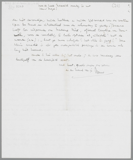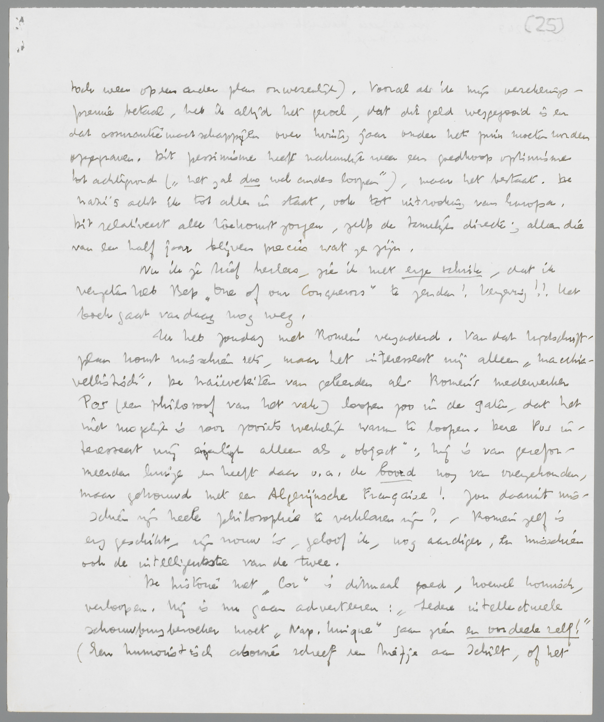 Ik heb Zondag met Romein vergaderd. Van dat tijdschriftplan komt misschien iets, maar het interesseert mij alleen ‘macchiavellistisch’. De naiëveteiten van geleerden als Romein's medewerker Pos (een philosoof van het vak) loopen zoo in de gaten, dat het niet mogelijk is voor zooiets werkelijk warm te loopen. Deze Pos interesseert mij eigenlijk alleen als ‘object’; hij is van gereformeerden huize en heeft daar o.a. de boord nog van overgehouden, maar getrouwd met een Algerijnsche Française! Zou daaruit misschien zijn heele philosophie te verklaren zijn? Romein zelf is erg geschikt, zijn vrouw is, geloof ik, nog aardiger, en misschien ook de intelligentste van de twee.