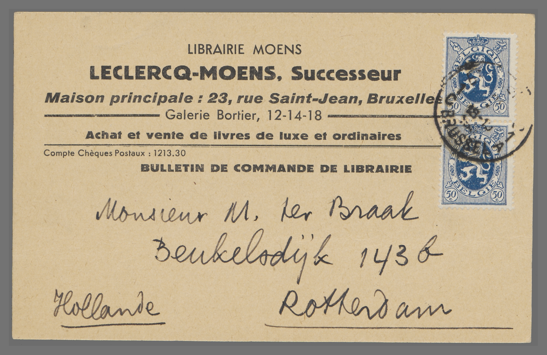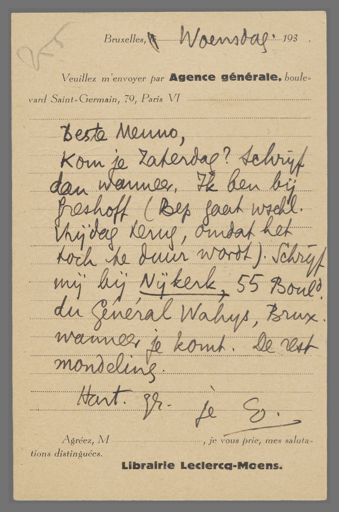 Kom je zaterdag? Schrijf dan wanneer. Ik ben bij Greshoff (Bep gaat wschl. vrijdag terug, omdat het toch te duur wordt). Schrijf mij bij Nijkerk, 55 Bould. du Général Wahys, Brux. wanneer je komt. De rest mondeling.