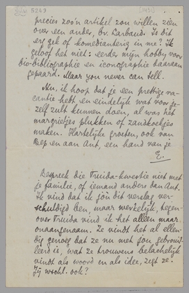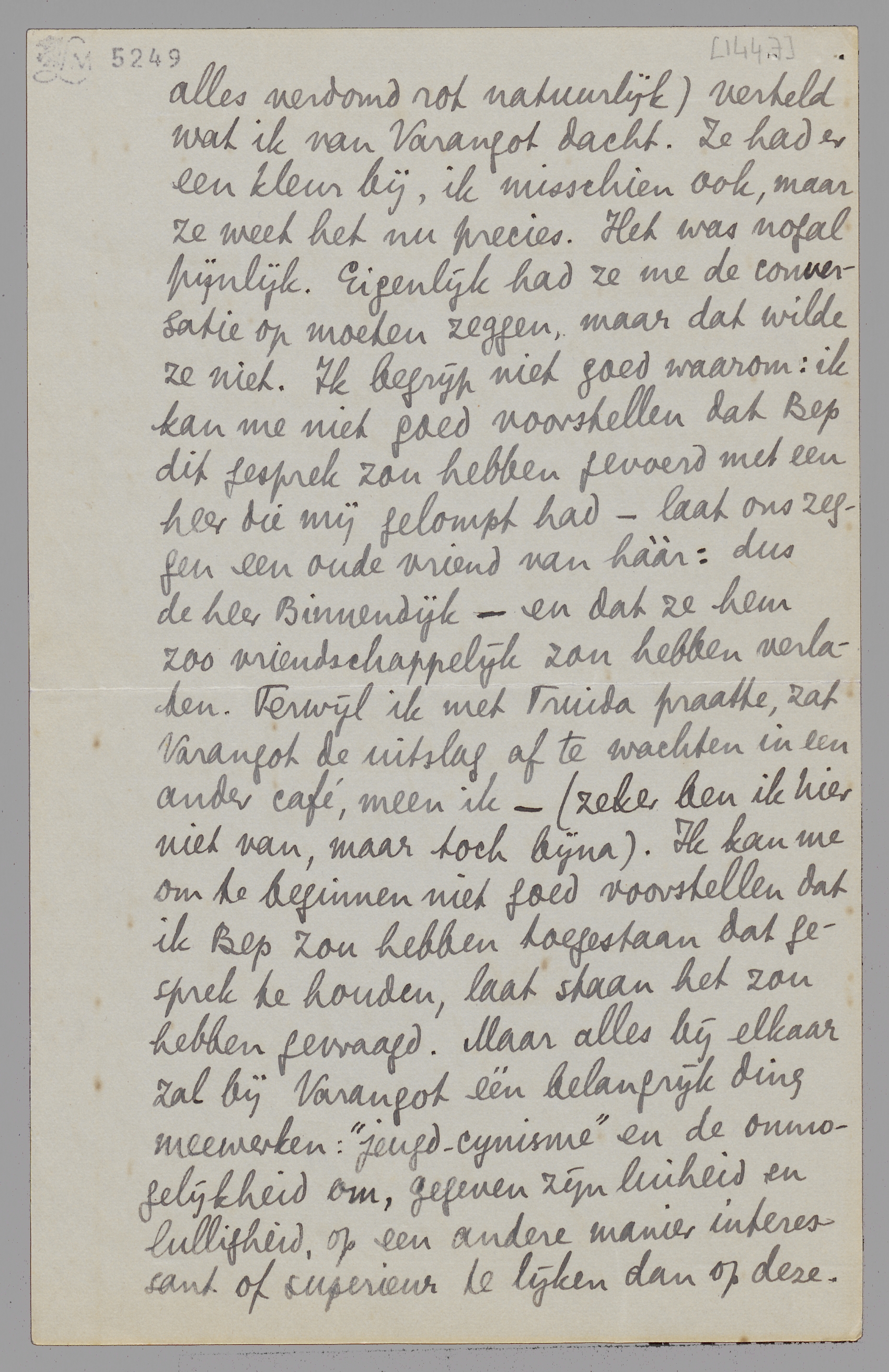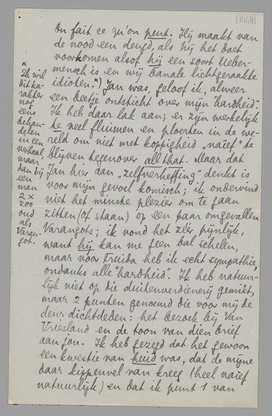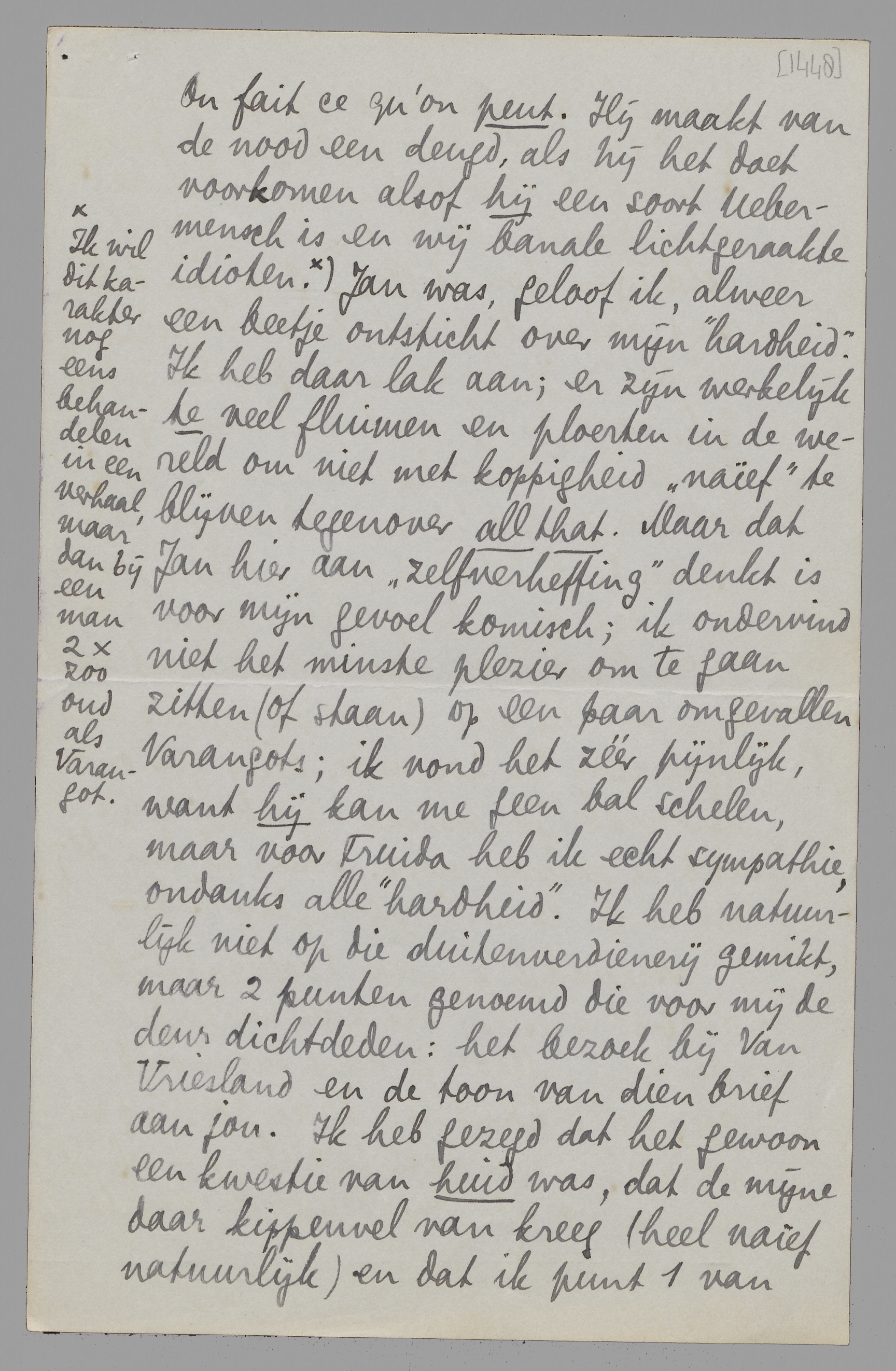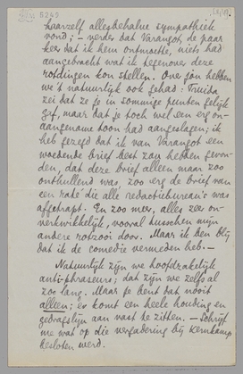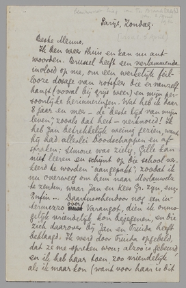 Ik ben weer thuis en kan nu antwoorden. Brussel heeft een verlammende invloed op me, om een werkelijk feillooze dosage van rotsfeer die er vanzelf hangt (vooral bij grijs weer) en mijn persoonlijke herinneringen. Wat heb ik daar 8 jaar en meer - de ‘beste tijd van mijn leven’, zooals dat heet - verknoeid! Ik heb Jan betrekkelijk weinig gezien, want hij had allerlei boodschappen en afspraken; Simone was zielig, Gille kan niet leeren en schijnt op die school verkeerd te worden ‘aangepakt’, zoodat ik nu overweeg om hem naar Morlanwelz te zenden, waar Jan en Kees Gr. zijn, enz. Enfin... Daartusschendoor nog een intermezzo over Varangot, dien ik onmogelijk vriendelijk kon bejegenen, en die zich daarover bij Jan en Truida heeft beklaagd. Ik werd door Truida opgebeld, dat ze me spreken wou; alzoo is gebeurd, en ik heb haar toen, zoo vriendelijk als ik maar kon (want voor haar is dit alles verdomd rot natuurlijk) verteld wat ik van Varangot dacht. Ze had er een kleur bij, ik misschien ook, maar ze weet het nu precies. Het was nogal pijnlijk. Eigenlijk had ze me de conversatie op moeten zeggen, maar dat wilde ze niet. Ik begrijp niet goed waarom: ik kan me niet goed voorstellen dat Bep dit gesprek zou hebben gevoerd met een heer die mij gelompt had – laat ons zeggen een oude vriend van hààr: dus de heer Binnendijk – en dat ze hem zoo vriendschappelijk zou hebben verlaten. Terwijl ik met Truida praatte, zat Varangot de uitslag af te wachten in een ander café, meen ik – (zeker ben ik hier niet van, maar toch bijna). Ik kan me om te beginnen niet goed voorstellen dat ik Bep zou hebben toegestaan dat gesprek te houden, laat staan het zou hebben gevraagd. Maar alles bij elkaar zal bij Varangot één belangrijk ding meewerken: ‘jeugd-cynisme’ en de onmogelijkheid om, gegeven zijn luiheid en lulligheid, op een andere manier interessant of superieur te lijken dan op deze. On fait ce qu’on peut. Hij maakt van de nood een deugd, als hij het doet voorkomen alsof hij een soort Uebermensch is en wij banale lichtgeraakte idioten. [Ik wil dit karakter nog eens behandelen in een verhaal, maar dan bij een man 2x zoo oud als Varangot.] Jan was, geloof ik, al weer een beetje ontsticht over mijn ‘hardheid’. Ik heb daar lak aan; er zijn werkelijk te veel fluimen en ploerten in de wereld om niet met koppigheid ‘naïef’ te blijven tegenover all that. Maar dat Jan hier aan ‘zelfverheffing’ denkt is voor mijn gevoel komisch; ik ondervind niet het minste plezier om te gaan zitten (of staan) op een paar omgevallen Varangots; ik vond het zéér pijnlijk, want hij kan me geen bal schelen, maar voor Truida heb ik echt sympathie, ondanks alle ‘hardheid’. Ik heb natuurlijk niet op die duitenverdienerij gemikt, maar 2 punten genoemd die voor mij de deur dicht deden: het bezoek bij Van Vriesland en de toon van dien brief aan jou. Ik heb gezegd dat het gewoon een kwestie van huid was, dat de mijne daar kippenvel van kreeg (heel naïef natuurlijk) en dat ik punt 1 van haarzelf allesbehalve sympathiek vond; - verder dat Varangot de paar keer dat ik hem ontmoette, niets had aangebracht wat ik tegenover deze rotdingen kon stellen. Over jou hebben we’t natuurlijk ook gehad: Truida zei dat ze je in sommige punten gelijk gaf, maar dat je toch wel een erg onaangename toon had aangeslagen; ik heb gezegd dat ik van Varangot een woedende brief best zou hebben gevonden, dat deze brief alleen maar zoo onthullend was, zoo erg de brief van een raté die alle redactiebureau’s was afgetrapt. En zoo meer, alles zeer onverkwikkelijk, vooral tusschen mijn andere rotzooi door. Maar ik ben blij dat ik de comedie vermeden heb. –