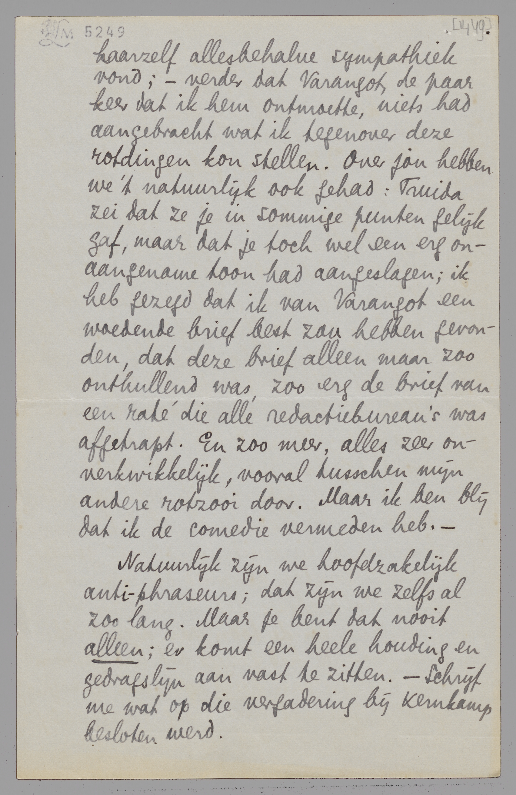Natuurlijk zijn we hoofdzakelijk anti-phraseurs; dat zijn we zelfs al zoo lang. Maar je bent dat nooit alleen; er komt een heele houding en gedragslijn aan vast te zitten. - Schrijf me wat op die vergadering bij Kernkamp besloten werd.