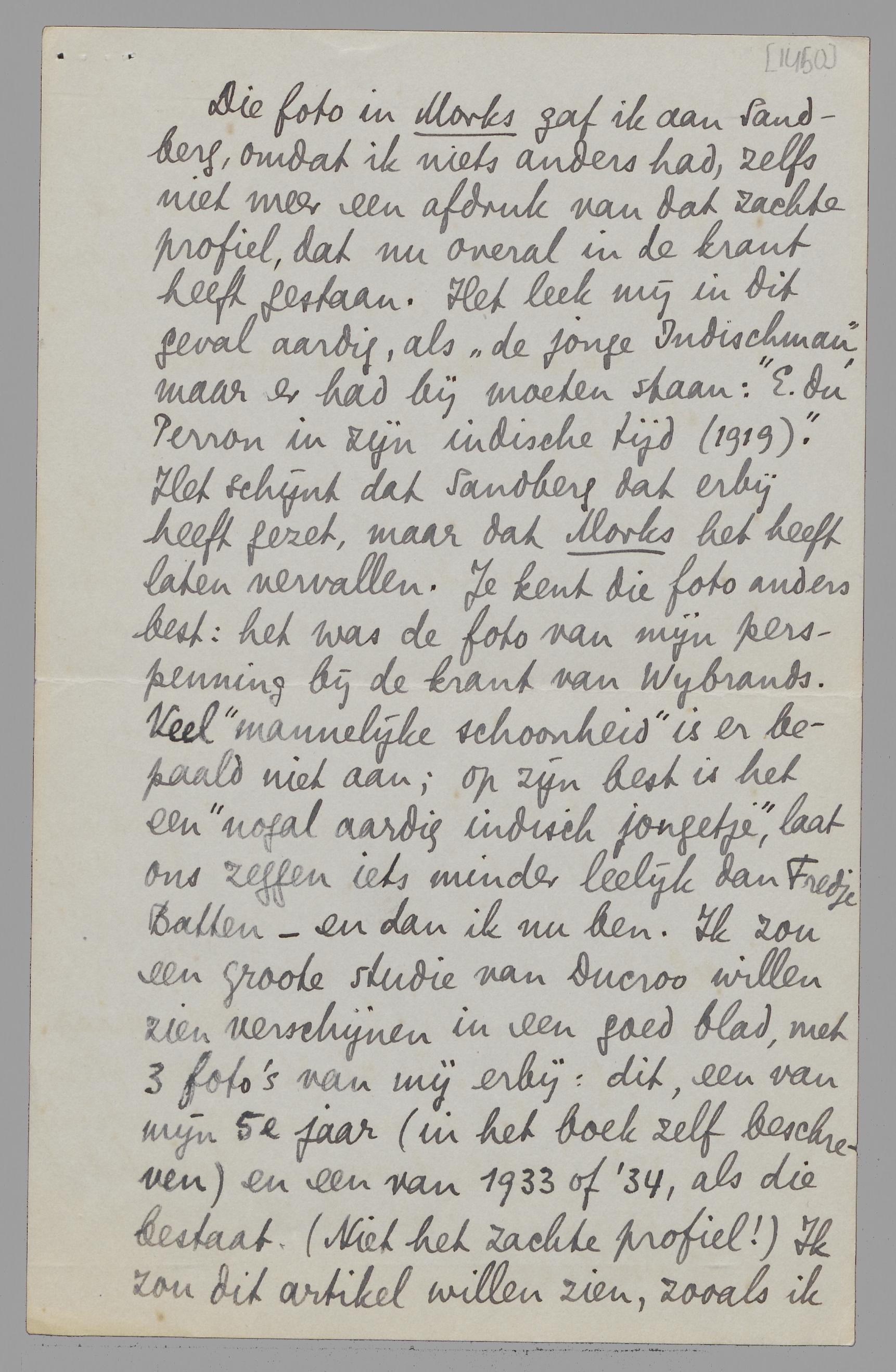 Die foto in Morks gaf ik aan Sandberg, omdat ik niets anders had, zelfs niet meer een afdruk van dat zachte profiel, dat nu overal in de krant heeft gestaan. Het leek mij in dit geval aardig, als ‘de jonge Indischman’, maar er had bij moeten staan: ‘E. du Perron in zijn indische tijd (1919)’.