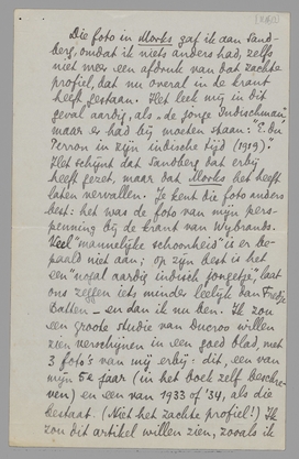 Het schijnt dat Sandberg dat erbij heeft gezet, maar dat Morks het heeft laten vervallen. Je kent die foto anders best: het was de foto van mijn perspenning bij de krant van Wijbrands. Veel ‘mannelijke schoonheid’ is er bepaald niet aan; op zijn best is het een ‘nogal aardig indisch jongetje’, laat ons zeggen iets minder leelijk dan Fredje Batten - en dan ik nu ben. Ik zou een groote studie van Ducroo willen zien verschijnen in een goed blad, met 3 foto's van mij erbij: dit, een van mijn 5e jaar (in het boek zelf beschreven) en een van 1933 of '34, als die bestaat. (Niet het zachte profiel!) Ik zou dit artikel willen zien, zooals ik precies zoo'n artikel zou willen zien over een ander, bv. Larbaud. Is dit erg gek of komedianterig in me? Ik geloof het niet: eerder mijn hobby voor bio-bibliographie en iconographie daaraan gepaard. Maar you never can tell.