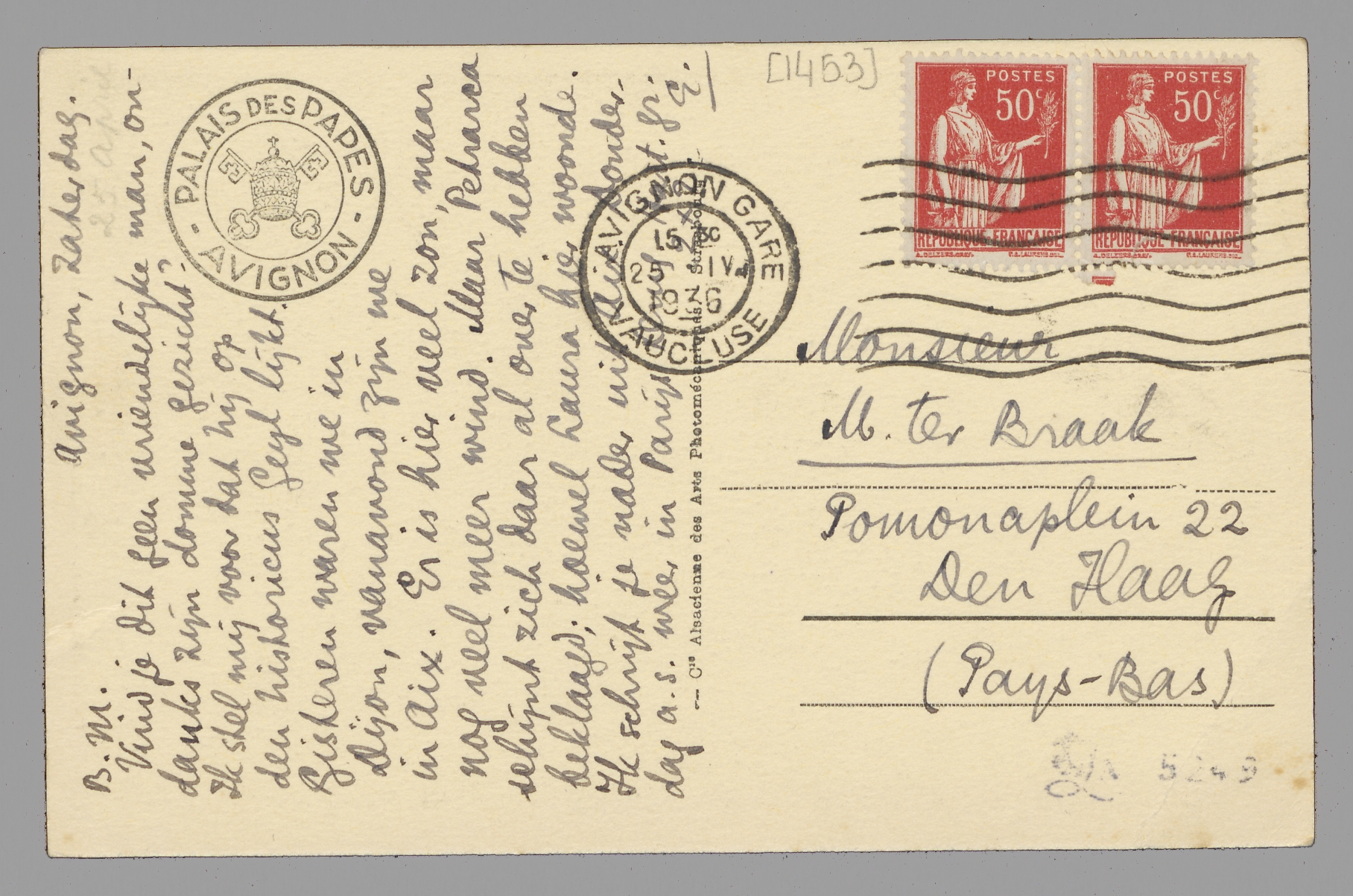 Vind je dit geen vriendelijke man, ondanks zijn domme gezicht? Ik stel mij voor dat hij op den historicus Geyl lijkt. Gisteren waren we in Dijon, vanavond zijn we in Aix. Er is hier veel zon, maar nog veel meer wind. Maar Petrarca schijnt zich daar al over te hebben beklaagd; hoewel Laura hier woonde. Ik schrijf je nader uit Aix. Donderdag a.s. weer in Parijs terug.