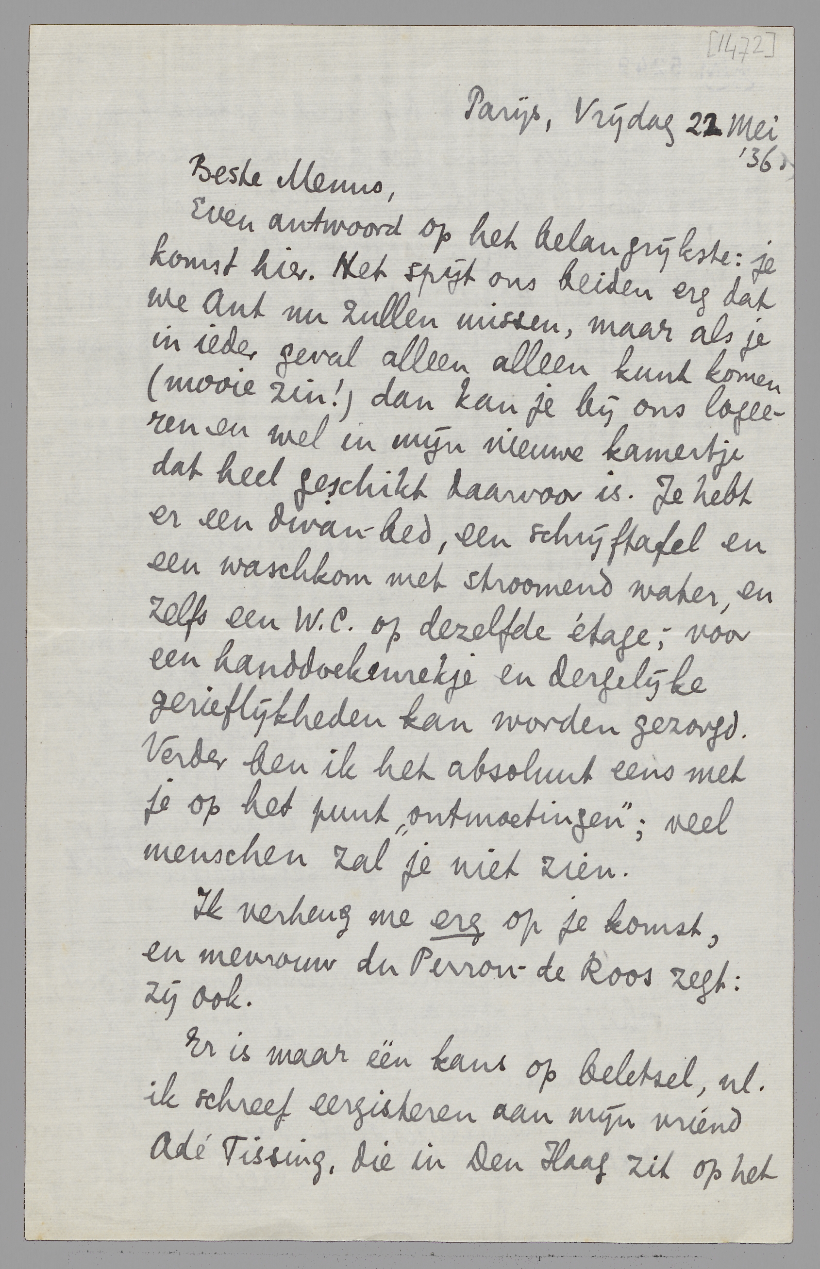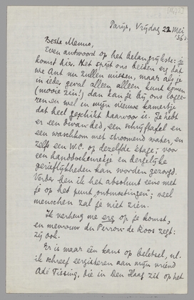 Even antwoord op het belangrijkste: je komst hier. Het spijt ons beiden erg dat we Ant nu zullen missen, maar als je in ieder geval alleen alleen kunt komen (mooie zin!) dan kan je bij ons logeeren en wel in mijn nieuwe kamertje dat heel geschikt daarvoor is. Je hebt er een divan-bed, een schrijftafel en een waschkom met stroomend water, en zelfs een W.C. op dezelfde étage; voor een handdoekenrekje en dergelijke gerieflijkheden kan worden gezorgd. Verder ben ik het absoluut eens met je op het punt ‘ontmoetingen’; veel menschen zal je niet zien.