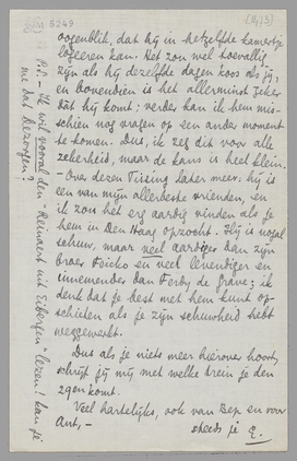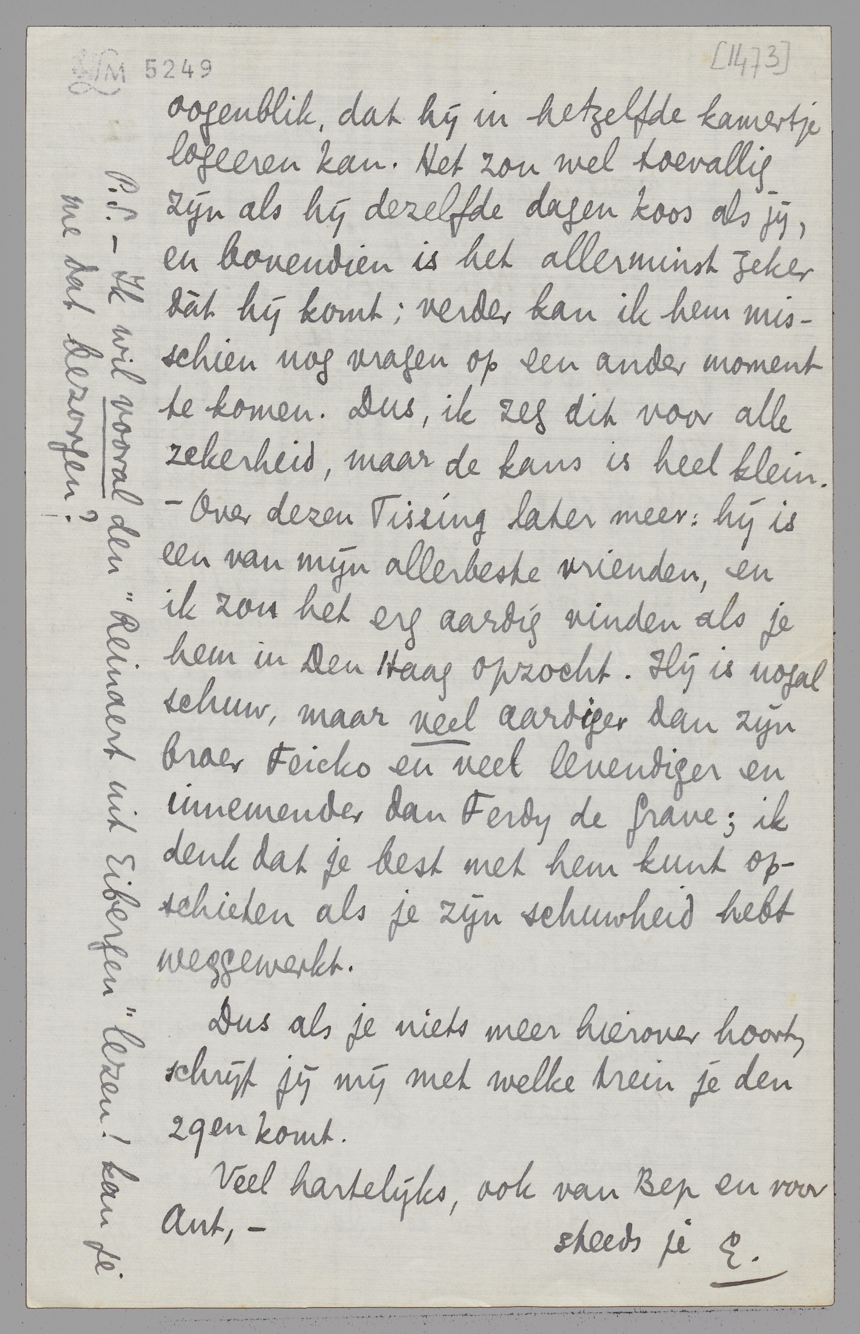 Er is maar één kans op beletsel, nl. ik schreef eergisteren aan mijn vriend Adé Tissing, die in Den Haag zit op het oogenblik, dat hij in hetzelfde kamertje logeeren kan. Het zou wel toevallig zijn als hij dezelfde dagen koos als jij, en bovendien is het allerminst zeker dàt hij komt; verder kan ik hem misschien nog vragen op een ander moment te komen. Dus, ik zeg dit voor alle zekerheid, maar de kans is heel klein. - Over dezen Tissing later meer: hij is een van mijn allerbeste vrienden, en ik zou het erg aardig vinden als je hem in Den Haag opzocht. Hij is nogal schuw, maar veel aardiger dan zijn broer Feicko en veel levendiger en innemender dan Ferdy de Grave; ik denk dat je best met hem kunt opschieten als je zijn schuwheid hebt weggewerkt.