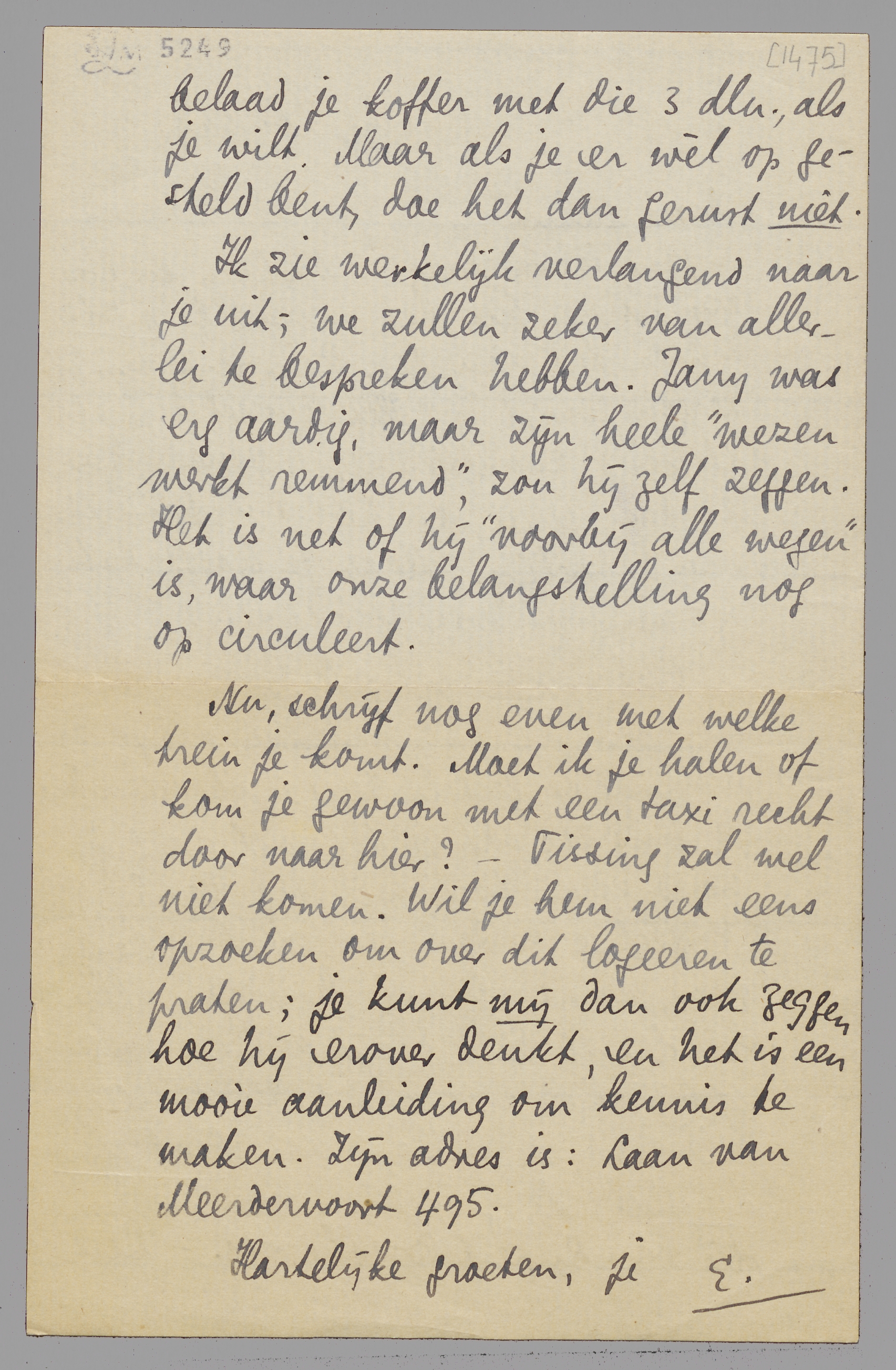 Nu, schrijf nog even met welke trein je komt. Moet ik je halen of kom je gewoon met een taxi recht door naar hier? - Tissing zal wel niet komen. Wil je hem niet eens opzoeken om over dit logeeren te praten; je kunt mij dan ook zeggen hoe hij erover denkt, en het is een mooie aanleiding om kennis te maken. Zijn adres is: Laan van Meerdervoort 495.