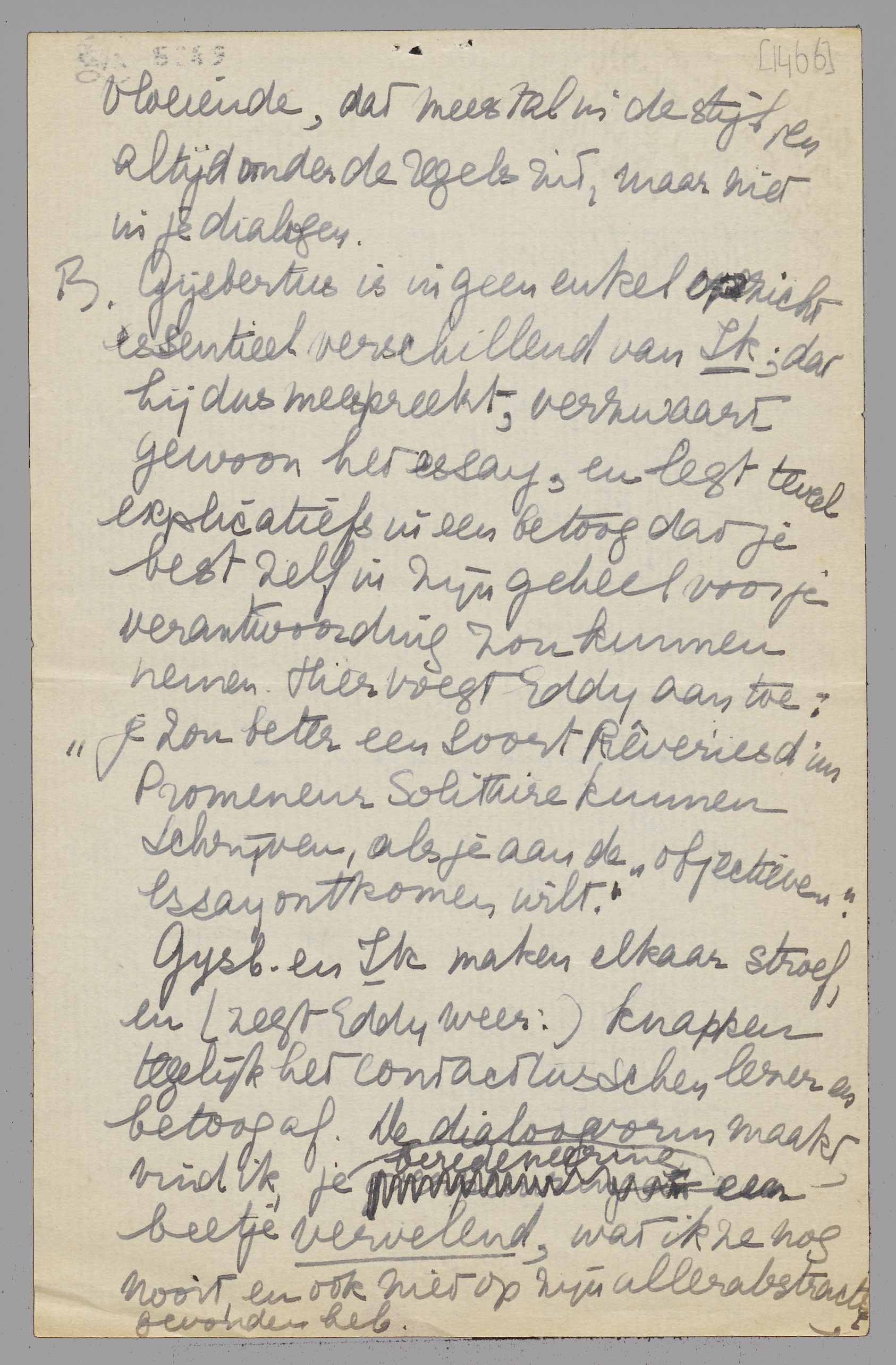B. Gijsbertus is in geen enkel opzicht essentieel verschillend van Ik; dat hij dus meespreekt, verzwaart gewoon het essay, en legt teveel explicatiefs in een betoog dat je best zelf in zijn geheel voor je verantwoording zou kunnen nemen. Hier voegt Eddy aan toe: ‘je zou beter een soort Rêveries d'un Promeneur Solitaire kunnen schrijven, als je aan de “objectieven” essay ontkomen wilt’.