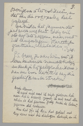 M.t.B. alleen denkend is 100 × zoo pakkend als Ik-en-Gijs. De weerstand komt dan van den lezer zelf, die hier tot toehoorder wordt en daarbij al gauw onverschillig, ook als hij, zooals wij, voor jouw denken alle vriendschap en aandacht heeft. Je bent in je vorm gewoon op een dwaalweg; maar het lijkt mij erg gemakkelijk om op deze tekst alles tot monoloog of zoo om te werken, en daarvoor is het misschien juist heel goed dat die schim van Gijs er eerst geweest is. Probeer het eens, in gedachten.