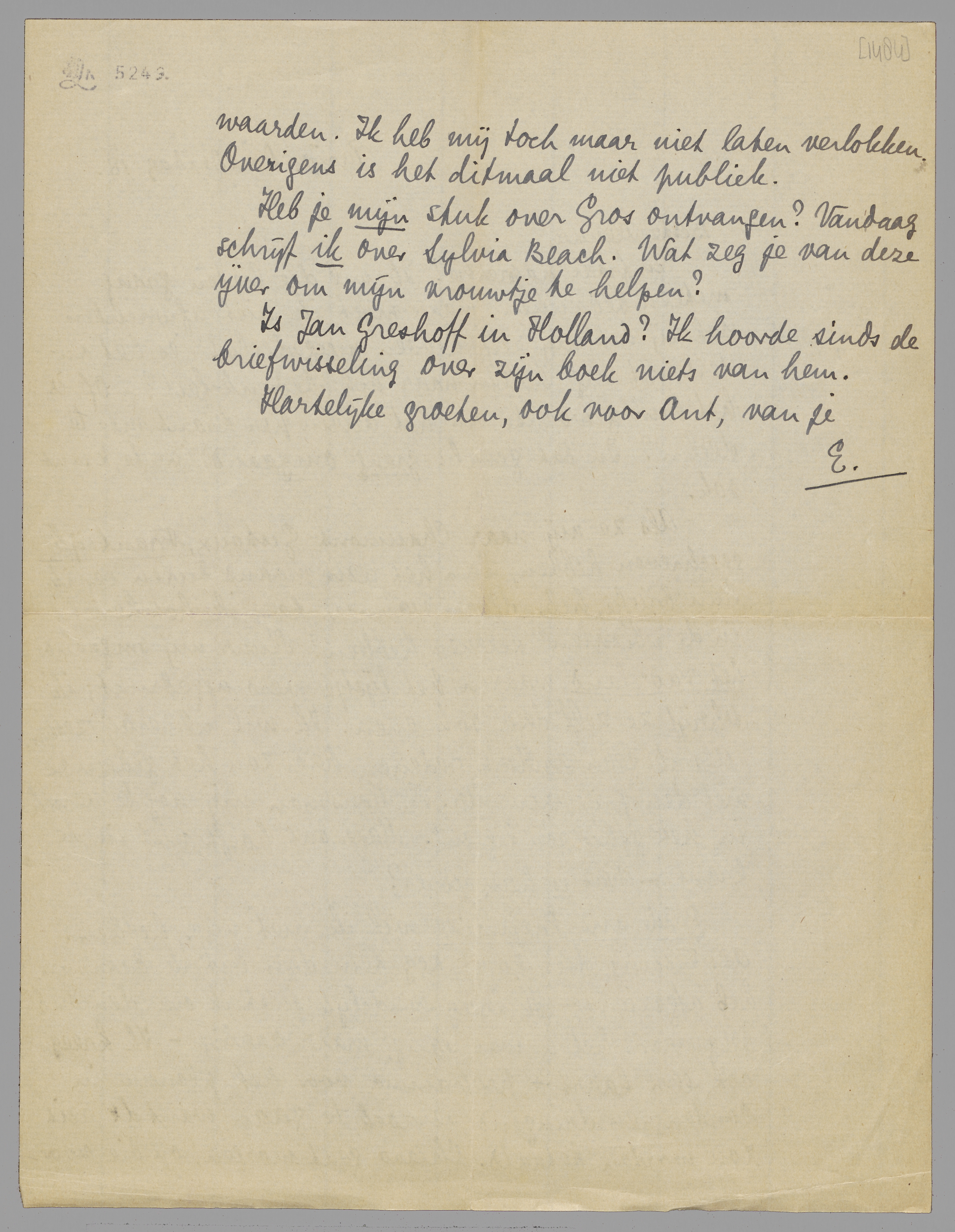 Heb je mijn stuk over Gros ontvangen? Vandaag schrijf ik over Sylvia Beach. Wat zeg je van deze ijver om mijn vrouwtje te helpen?