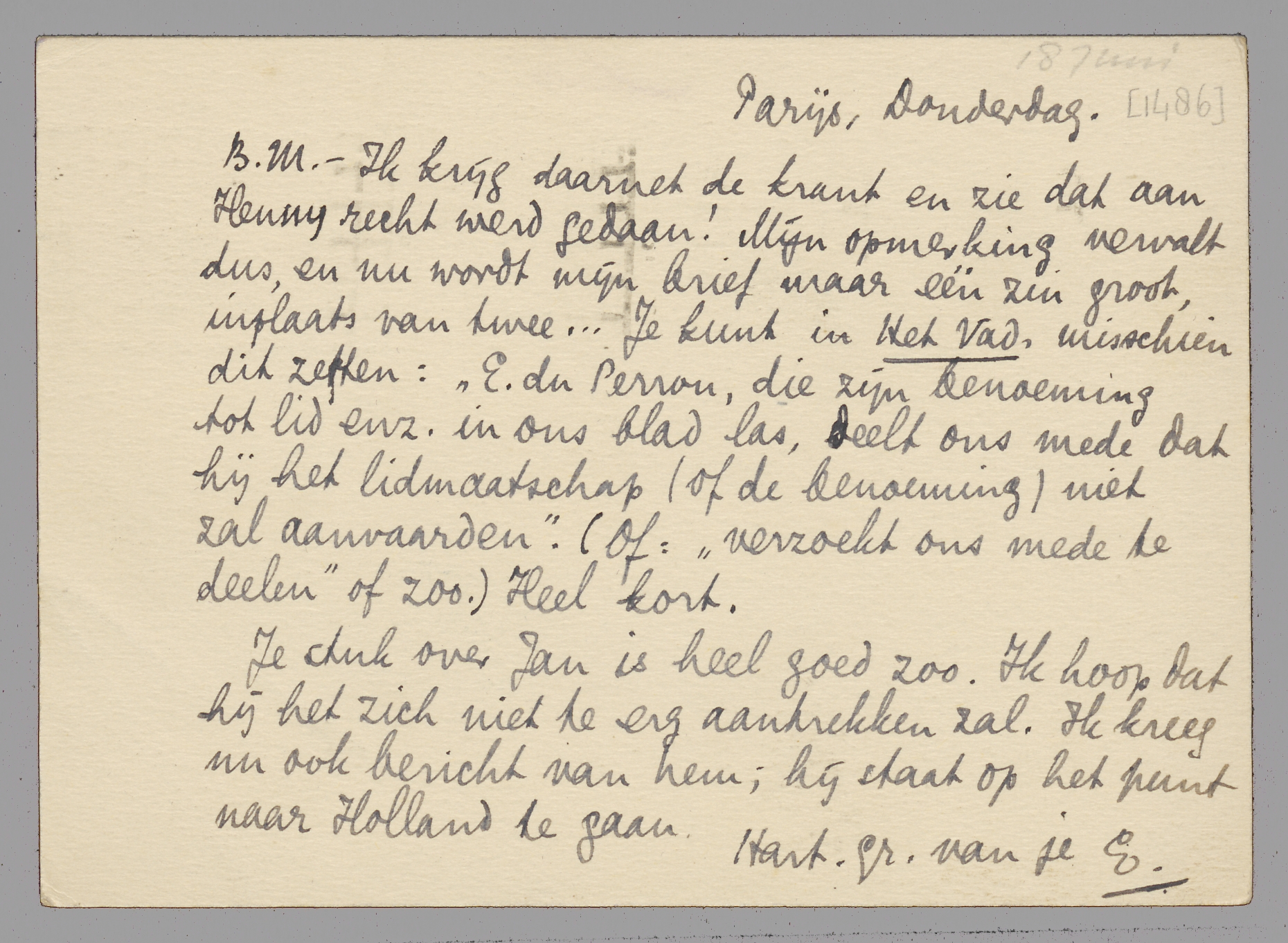 Ik krijg daarnet de krant en zie dat aan Henny recht werd gedaan! Mijn opmerking vervalt dus, en nu wordt mijn brief maar één zin groot, inplaats van twee... Je kunt in Het Vad. misschien dit zetten: ‘E. du Perron, die zijn benoeming tot lid enz. in ons blad las, deelt ons mede dat hij het lidmaatschap (of de benoeming) niet zal aanvaarden’. (Of: ‘verzoekt ons mede te deelen’ of zoo.) Heel kort.