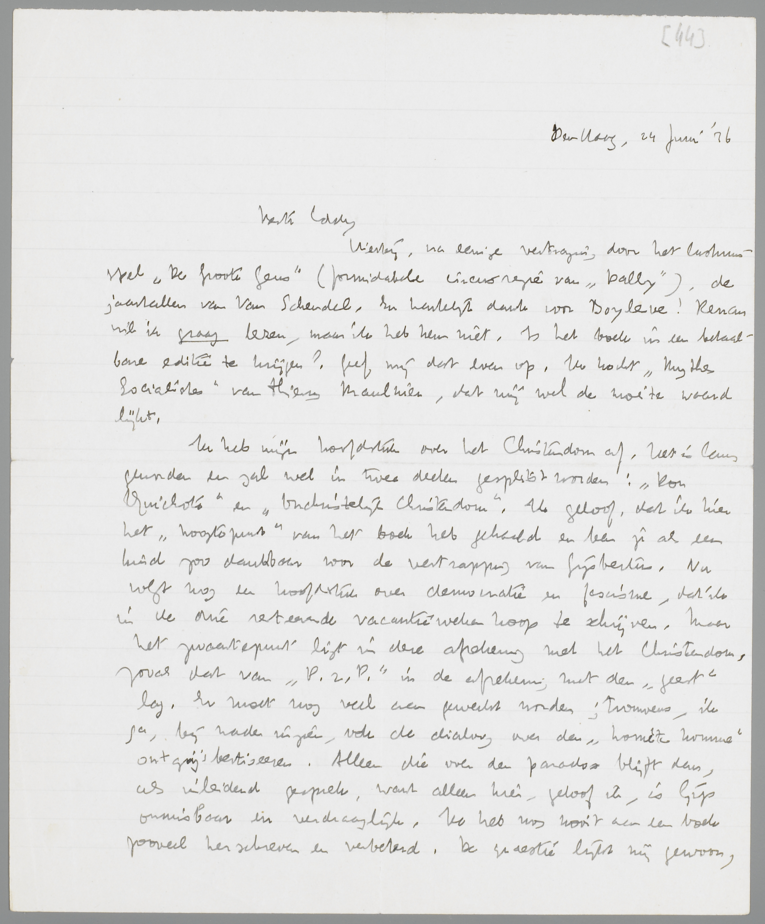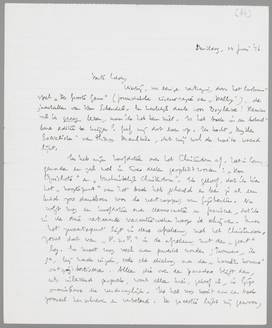 Ik heb mijn hoofdstuk over het Christendom af. Het is lang geworden en zal wel in twee deelen gesplitst worden: Don Quichotte en Onchristelijk Christendom. Ik geloof, dat ik hier het ‘hoogtepunt’ van het boek heb gehaald en ben je als een kind zoo dankbaar voor de vertrapping van Gijsbertus. Nu volgt nog een hoofdstuk over democratie en fascisme, dat ik in de drie resteerende vacantieweken hoop te schrijven. Maar het zwaartepunt ligt in deze afrekening met het Christendom, zooals dat van P.z.P. in de afrekening met den ‘geest’ lag. Er moet nog veel aan gewerkt worden; trouwens, ik ga, bij nader inzien, ook de dialoog over de honnête homme ontgijsbertiseeren. Alleen die over den paradox blijft dan, als inleidend gesprek, want alleen hier, geloof ik, is Gijs onmisbaar en verdraaglijk. Ik heb nog nooit aan een boek zooveel herschreven en verbeterd. De quaestie lijkt mij gewoon, dat ik nog niet genoeg had gewacht met schrijven. Dat ongeduld kost me nu een paar weken omwerken! Maar kwaad kan het zeker niet, dat Gijsbertus geleefd heeft... zonder werkelijk te leven!