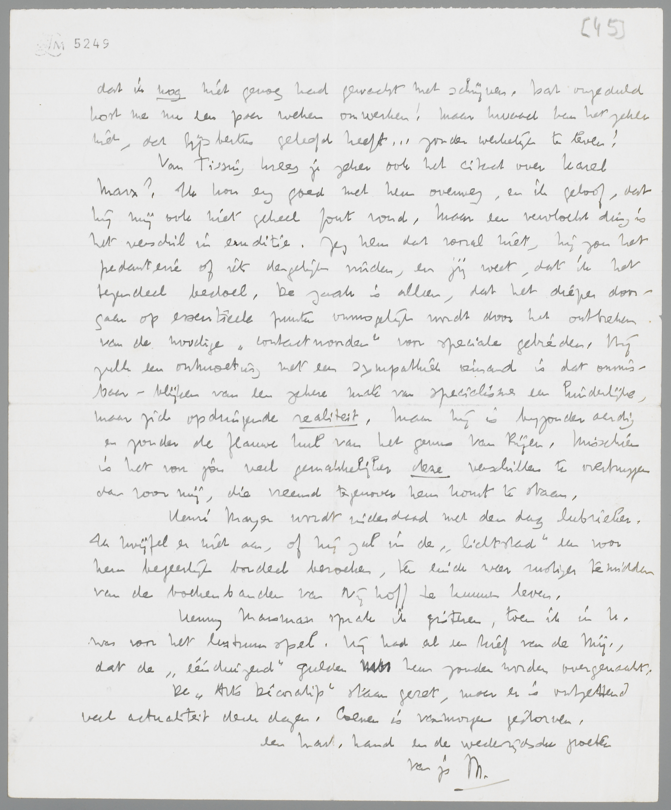 Van Tissing kreeg je zeker ook het citaat over Karel Marx? Ik kon erg goed met hem overweg, en ik geloof, dat hij mij ook niet geheel fout vond. Maar een vervloekt ding is het verschil in eruditie. Zeg hem dat vooral niet, hij zou het pedanterie of iets dergelijks vinden, en jij weet, dat ik het tegendeel bedoel. De zaak is alleen, dat het dieper doorgaan op essentieele punten onmogelijk wordt door het ontbreken van de noodige ‘contactwoorden’ voor speciale gebieden. Bij zulk een ontmoeting met een sympathiek iemand is dat onmisbaar-blijken van een zekere mate van specialisme een hinderlijke, maar zich opdringende realiteit. Maar hij is bijzonder aardig en zonder de flauwe kul van het genus van Rijen. Misschien is het voor jou veel gemakkelijker deze verschillen te overbruggen dan voor mij, die vreemd tegenover hem komt te staan.