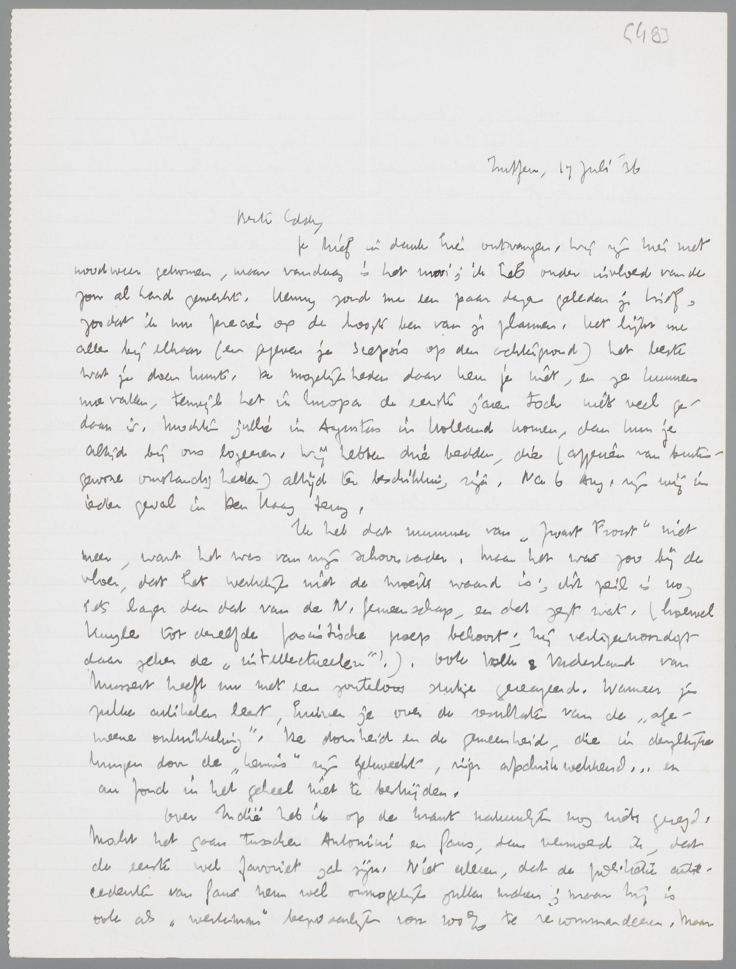 Je brief in dank hier ontvangen. Wij zijn hier met noodweer gekomen, maar vandaag is het mooi; ik heb onder invloed van de zon al hard gewerkt. Henny zond een paar dagen geleden je brief, zoodat ik nu precies op de hoogte ben van je plannen. Het lijkt me alles bij elkaar (en gegeven je scepsis op den achtergrond) het beste wat je doen kunt. De mogelijkheden daar ken je niet, en ze kunnen meevallen, terwijl het in Europa de eerste jaren toch niet veel gedaan is. Mochten jullie in Augustus in Holland komen, dan kun je altijd bij ons logeeren. Wij hebben drie bedden, die (afgezien van buitengewone omstandigheden) altijd ter beschikking zijn. Na 6 Aug. zijn wij in ieder geval in den Haag terug.