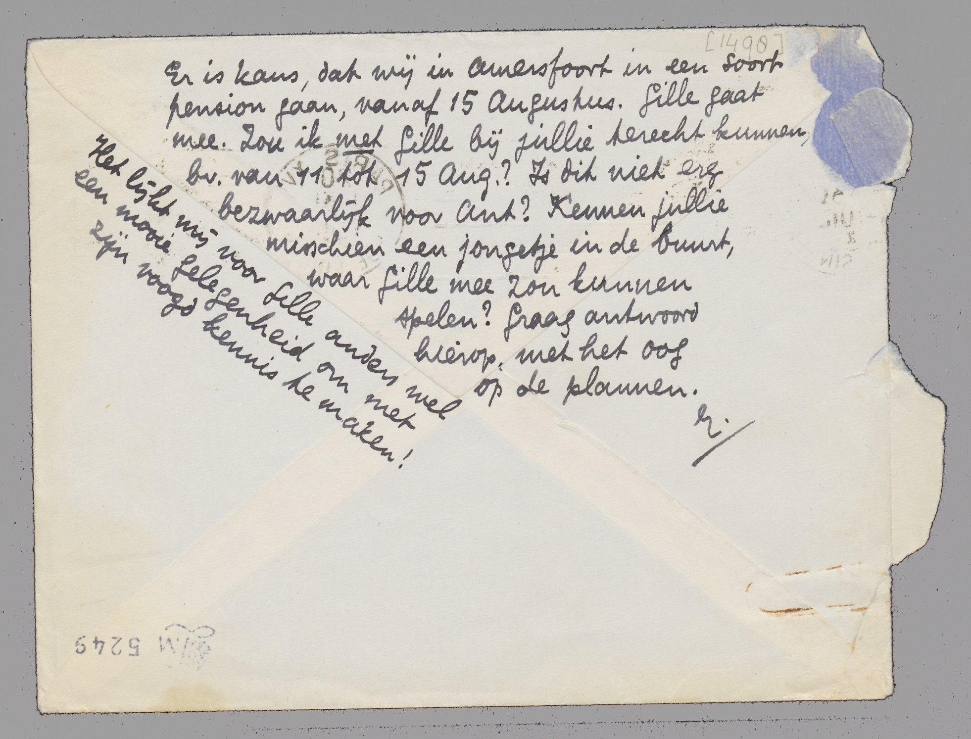 Er is kans dat wij in Amersfoort in een soort pension gaan, vanaf 15 Augustus. Gille gaat mee. Zou ik met Gille bij jullie terecht kunnen, bv. van 11 tot 15 Aug.? Is dit niet erg bezwaarlijk voor Ant? Kennen jullie misschien een jongetje in de buurt, waar Gille mee zou kunnen spelen? Graag antwoord hierop, met het oog op de plannen.