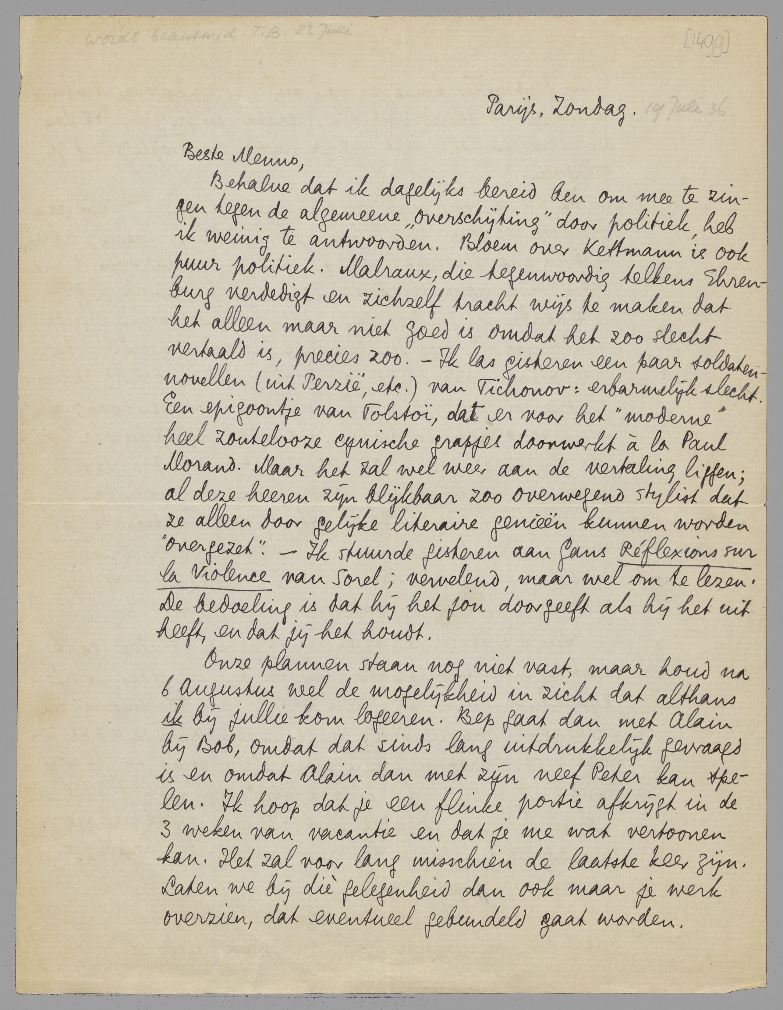 Behalve dat ik dagelijks bereid ben om mee te zingen tegen de algemeene ‘overschijting’ door politiek, heb ik weinig te antwoorden. Bloem over Kettmann is ook puur politiek. Malraux, die tegenwoordig telkens Ehrenburg verdedigt en zichzelf tracht wijs te maken dat het alleen maar niet goed is omdat het zoo slecht vertaald is, precies zoo. - Ik las gisteren een paar soldaten-novellen (uit Perzië, etc.) van Tichonov: erbarmelijk slecht. Een epigoontje van Tolstoi, dat er voor het ‘moderne’ heel zoutelooze cynische grapjes doorwerkt à la Paul Morand. Maar het zal wel weer aan de vertaling liggen; al deze heeren zijn blijkbaar zoo overwegend stylist dat ze alleen door gelijke literaire genieën kunnen worden ‘overgezet’. - Ik stuurde gisteren aan Gans Réflexions sur la Violence van Sorel; vervelend, maar wel om te lezen. De bedoeling is dat hij het jou doorgeeft als hij het uit heeft, en dat jij het houdt.