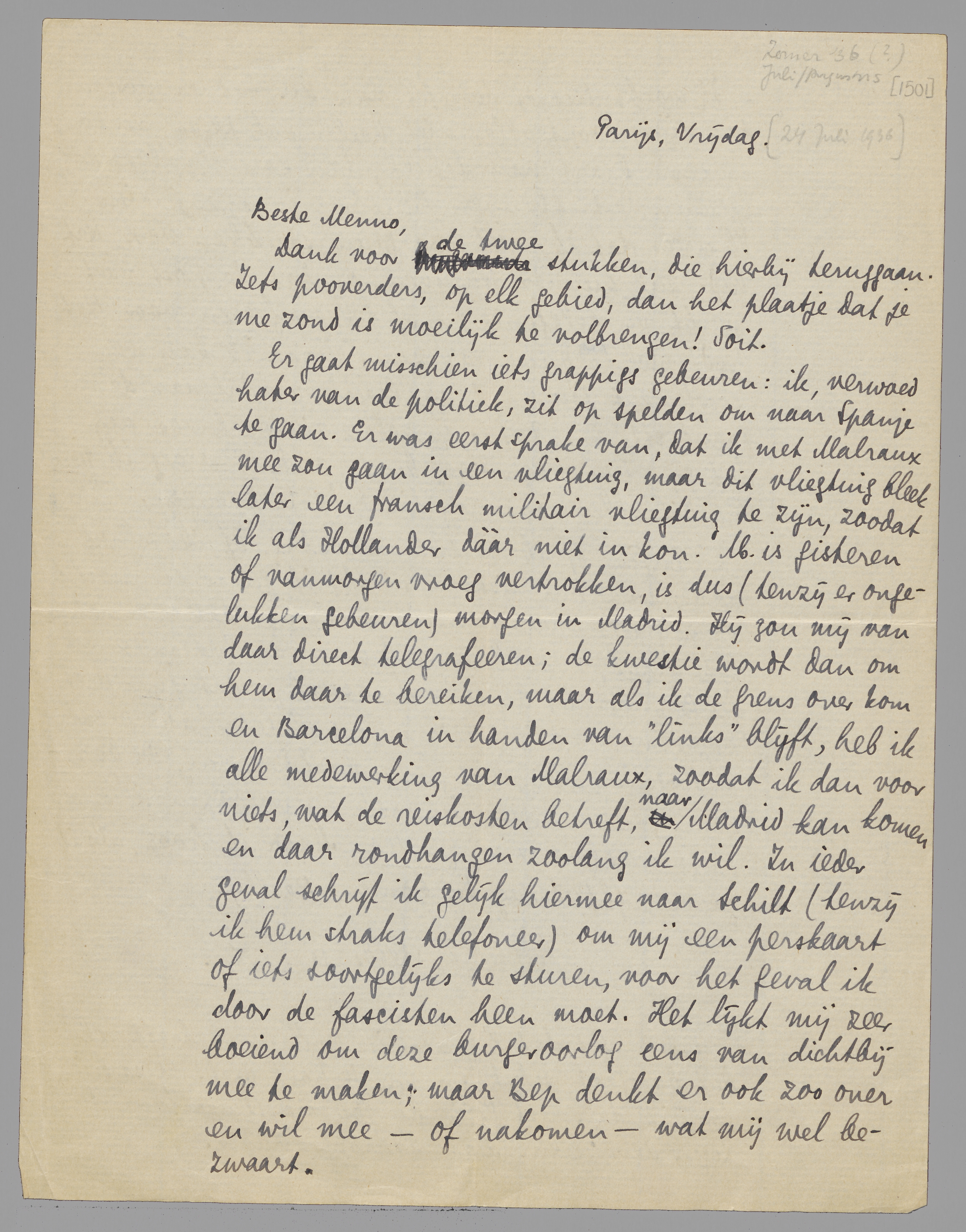 Er gaat misschien iets grappigs gebeuren: ik, verwoed hater van de politiek, zit op spelden om naar Spanje te gaan. Er was eerst sprake van, dat ik met Malraux mee zou gaan in een vliegtuig, maar dit vliegtuig bleek later een fransch militair vliegtuig te zijn, zoodat ik als Hollander dààr niet in kon. M. is gisteren of vanmorgen vroeg vertrokken, is dus (tenzij er ongelukken gebeuren) morgen in Madrid. Hij zou mij van daar direct telegrafeeren; de kwestie wordt dan om hem daar te bereiken, maar als ik de grens over kom en Barcelona in handen van ‘links’ blijft, heb ik alle medewerking van Malraux, zoodat ik dan voor niets, wat de reiskosten betreft, naar Madrid kan komen en daar rondhangen zoolang ik wil. In ieder geval schrijf ik gelijk hiermee naar Schilt (tenzij ik hem straks telefoneer) om mij een perskaart of iets soortgelijks te sturen, voor het geval ik door de fascisten heen moet. Het lijkt mij zeer boeiend om deze burgeroorlog eens van dichtbij mee te maken; maar Bep denkt er ook zoo over en wil mee - of nakomen - wat mij wel bezwaart.