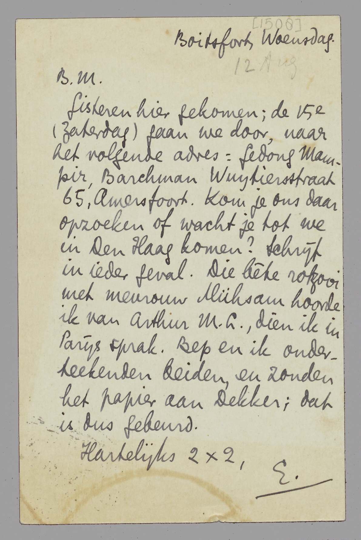 Gisteren hier gekomen; de 15e (Zaterdag) gaan we door, naar het volgende adres: Gedong Mampir, Barchman Wuytiersstraat 65, Amersfoort. Kom je ons daar opzoeken of wacht je tot we in Den Haag komen? Schrijf in ieder geval. Die bête rotzooi met mevrouw Mühsam hoorde ik van Arthur M.L., dien ik in Parijs sprak. Bep en ik onderteekenden beiden, en zonden het papier aan Dekker; dat is dus gebeurd.