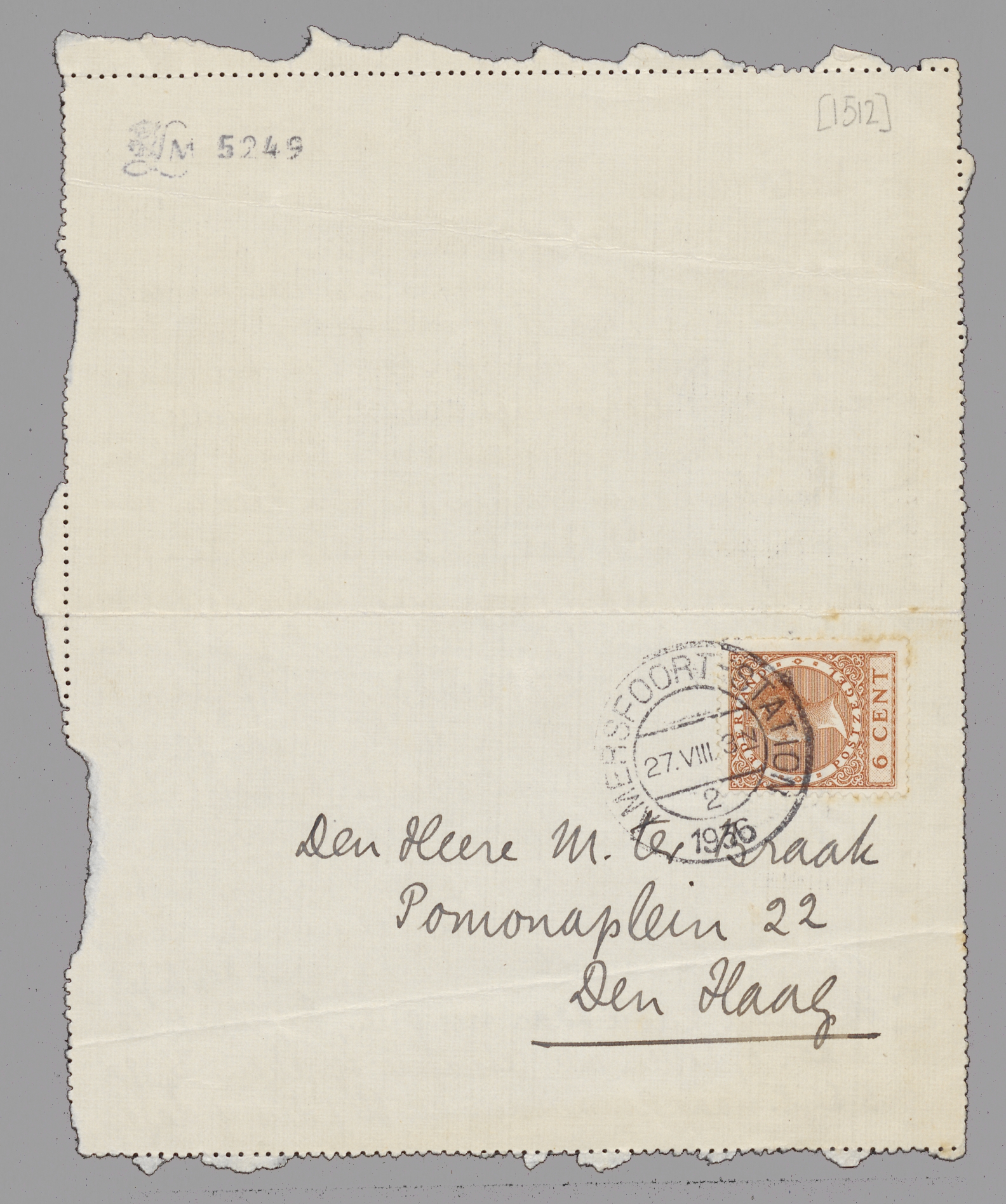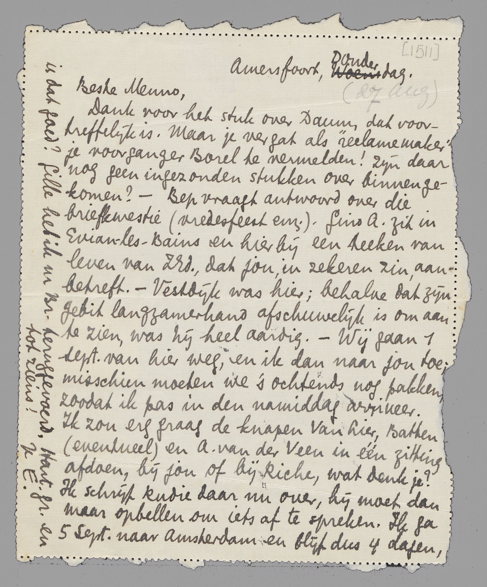 Dank voor het stuk over Daum, dat voortreffelijk is. Maar je vergat als ‘reclamemaker’ je voorganger Borel te vermelden! zijn daar nog geen ingezonden stukken over binnengekomen? - Bep vraagt antwoord over die briefkwestie (vredesfeest enz.). Gino A. zit in Evian-les-Bains en hierbij een teeken van leven van ZEd., dat jou, in zekeren zin, aanbetreft. - Vestdijk was hier; behalve dat zijn gebit langzamerhand afschuwelijk is om aan te zien, was hij heel aardig. - Wij gaan 1 Sept. van hier weg, en ik dan naar jou toe; misschien moeten we 's ochtends nog pakken, zoodat ik pas in den namiddag arriveer. Ik zou erg graag de knapen van Lier, Batten (eventueel) en A.v.d. Veen in één zitting afdoen, bij jou of bij Riche, wat denk je? Ik schrijf Rudie daar nu over, hij moet dan maar opbellen om iets af te spreken. Ik ga 5 Sept. naar Amsterdam en blijf dus 4 dagen, is dat goed? Gille heb ik nr Br. teruggevoerd. Hart. gr. en tot ziens!