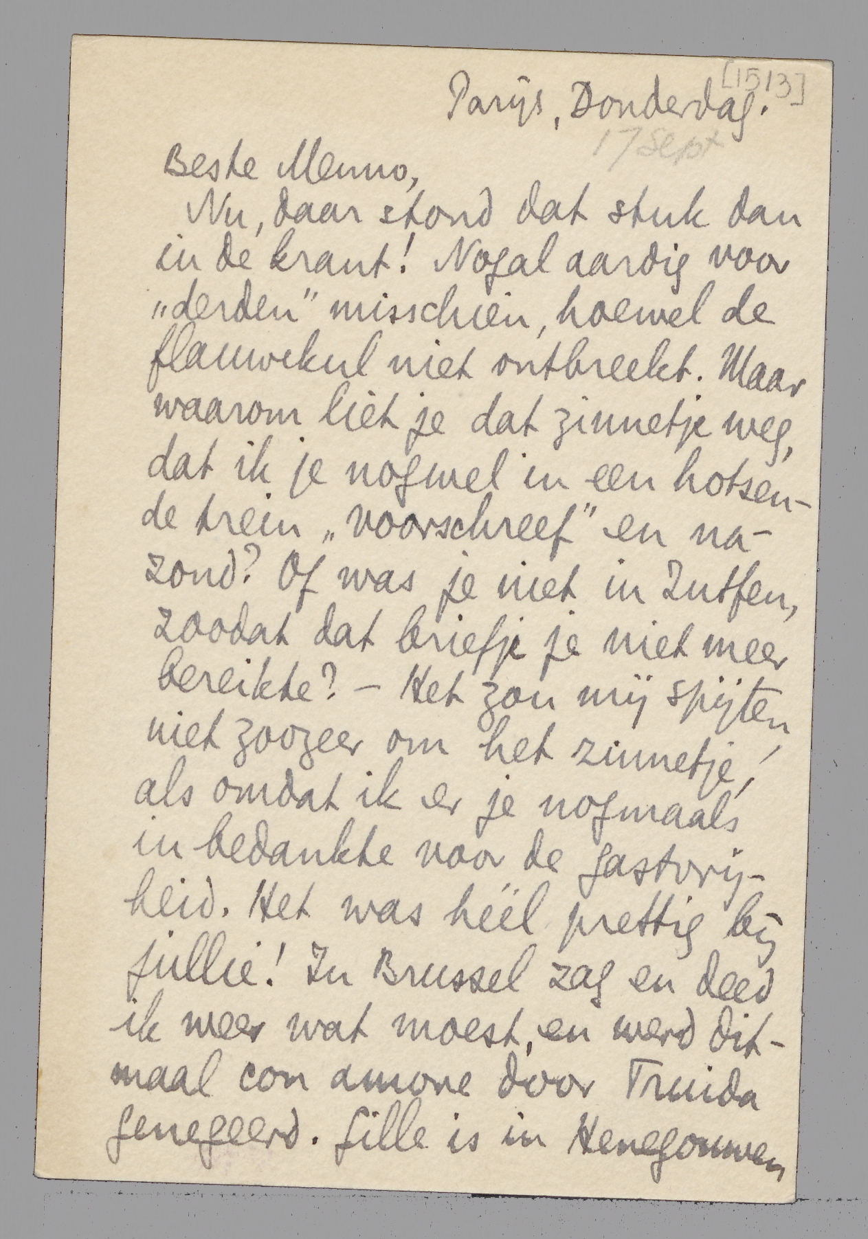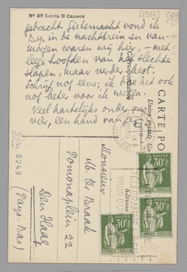 Nu, daar stond dat stuk dan in de krant! Nogal aardig voor ‘derden’ misschien, hoewel de flauwekul niet ontbreekt. Maar waarom liet je dat zinnetje weg, dat ik je nog wel in een hotsende trein ‘voorschreef’ en nazond? Of was je niet in Zutfen, zoodat het briefje je niet meer bereikte? - Het zou mij spijten niet zoozeer om het zinnetje, als omdat ik er je nogmaals in bedankte voor de gastvrijheid. Het was héél prettig bij jullie! In Brussel zag en deed ik weer wat moest, en werd ditmaal con amore door Truida genegeerd. Gille is in Henegouwen gebracht. Gisternacht vond ik Bep in de nachttrein en vanmorgen waren wij hier, - met leege hoofden van het slechte slapen, maar verder best. Schrijf nog eens; ik doe het ook nog beter voor ik wegga. Veel hartelijks onder ons vier, een hand van je