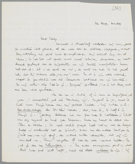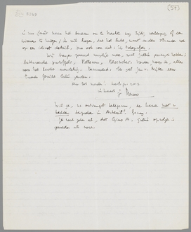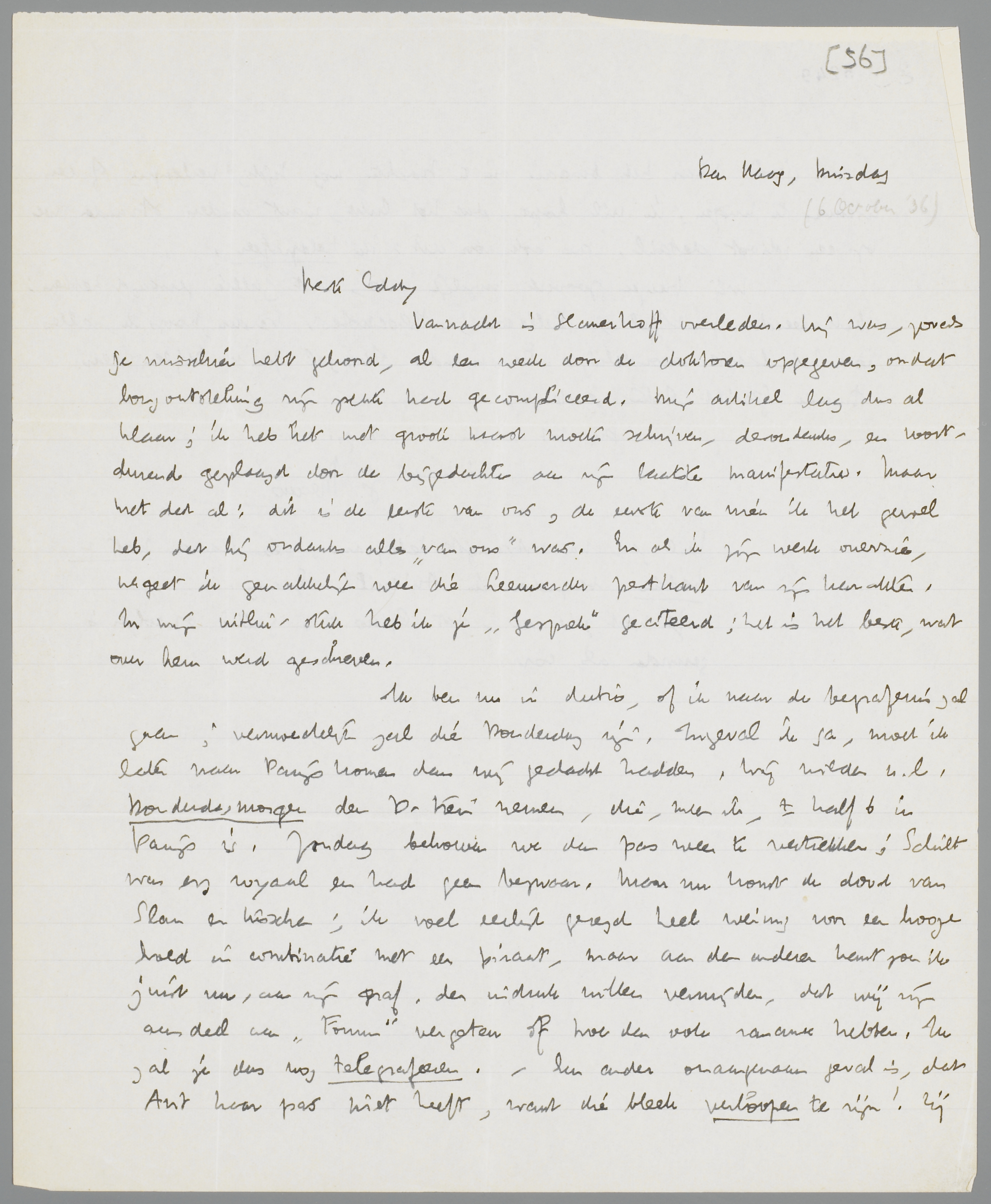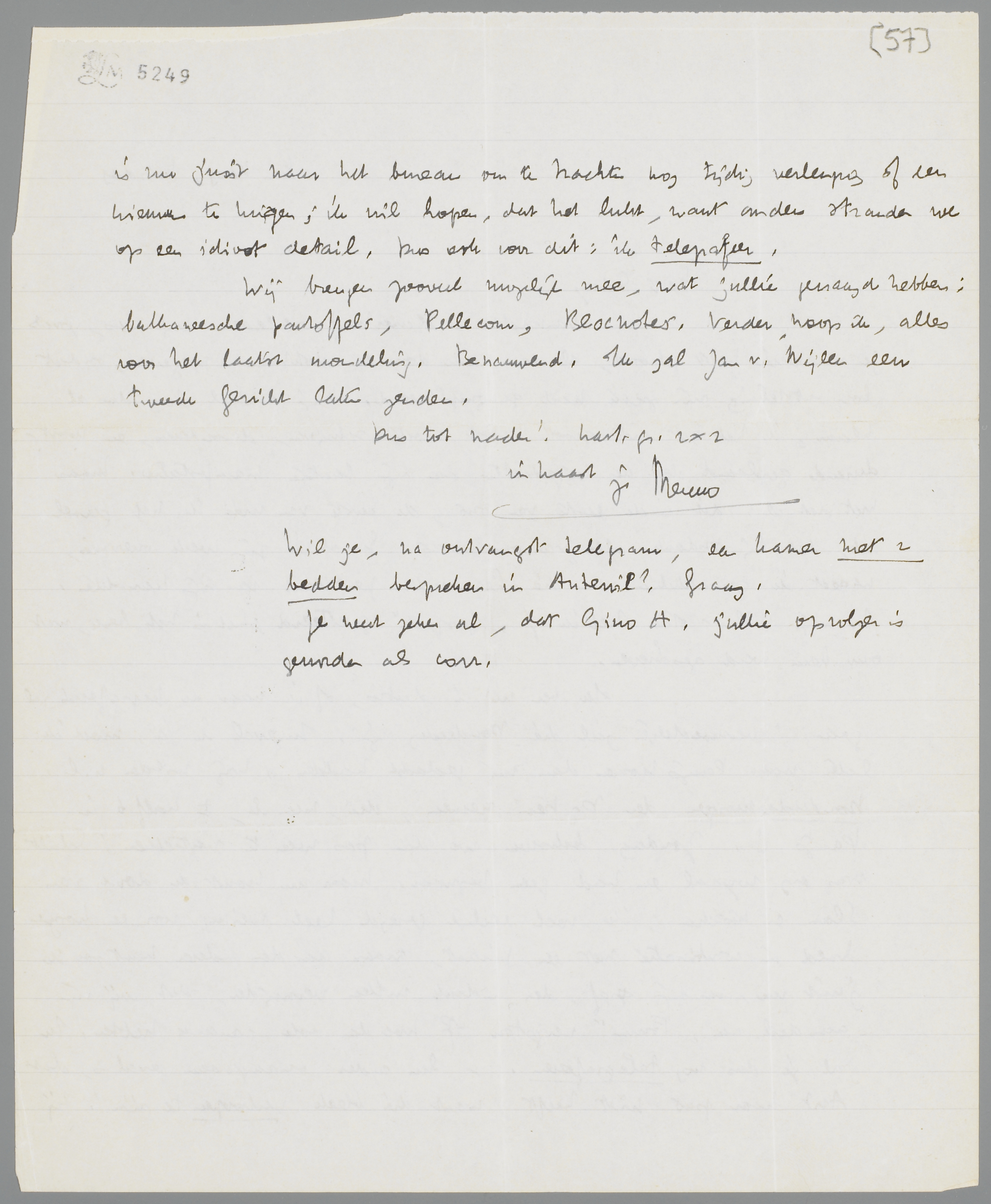 Ik ben nu in dubio, of ik naar de begrafenis zal gaan; vermoedelijk zal die Donderdag zijn. Ingeval ik ga, moet ik later naar Parijs komen dan wij gedacht hadden. Wij wilden n.l. Donderdagmorgen den D-trein nemen, die, meen ik, ± half 6 in Parijs is. Zondag behoeven we dan pas weer te vertrekken; Schilt was erg royaal en had geen bezwaar. Maar nu komt de dood van Slau er tusschen; ik voel eerlijk gezegd heel weinig voor een hooge hoed in combinatie met een piraat, maar aan den anderen kant zou ik juist nu, aan zijn graf, den indruk willen vermijden, dat wij zijn aandeel aan Forum vergeten of hoe dan ook rancune hebben. Ik zal je dus nog telegrafeeren. Een ander onaangenaam geval is, dat Ant haar pas niet heeft, want die bleek verloopen te zijn! Zij is nu juist naar het bureau om te trachten nog tijdig verlenging of een nieuwe te krijgen; ik wil hopen, dat het lukt, want anders stranden we op een idioot detail. Dus ook voor dit: ik telegrafeer.