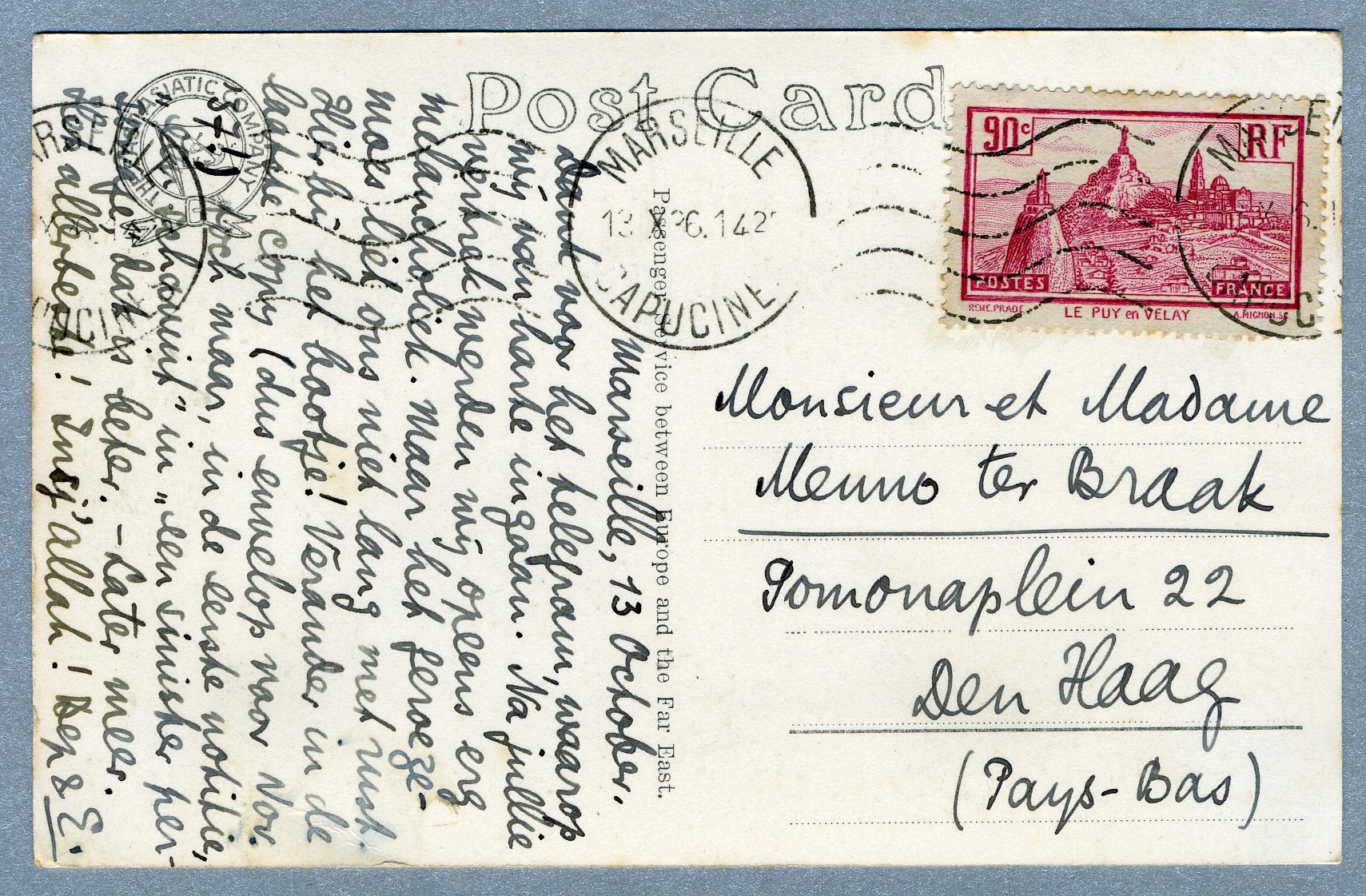 Dank voor het telegram, waarop wij van harte ingaan. Na jullie vertrek werden wij opeens erg melancholiek. Maar het geroezemoes liet ons niet lang met rust. Hierbij het bootje! Verander in de laatste copy (dus envelop voor Nov. '37!) toch maar, in de eerste notitie, ‘een schavuit’ in ‘een sinister personage’, dat is beter. – Later meer.
