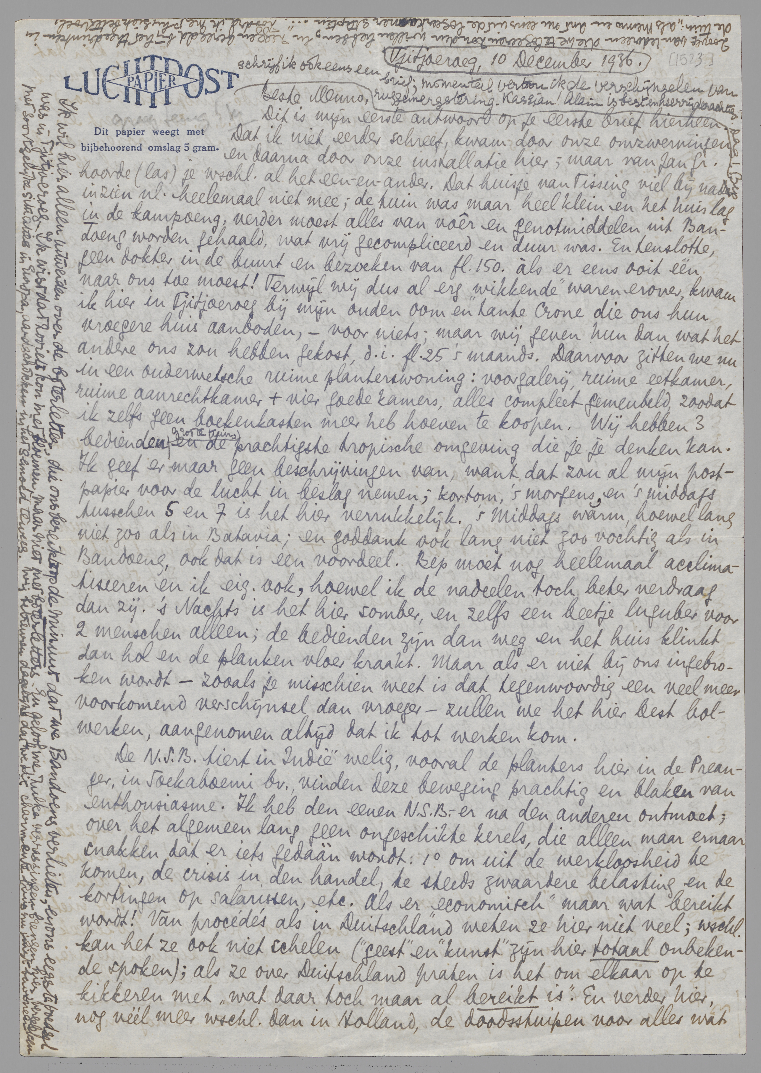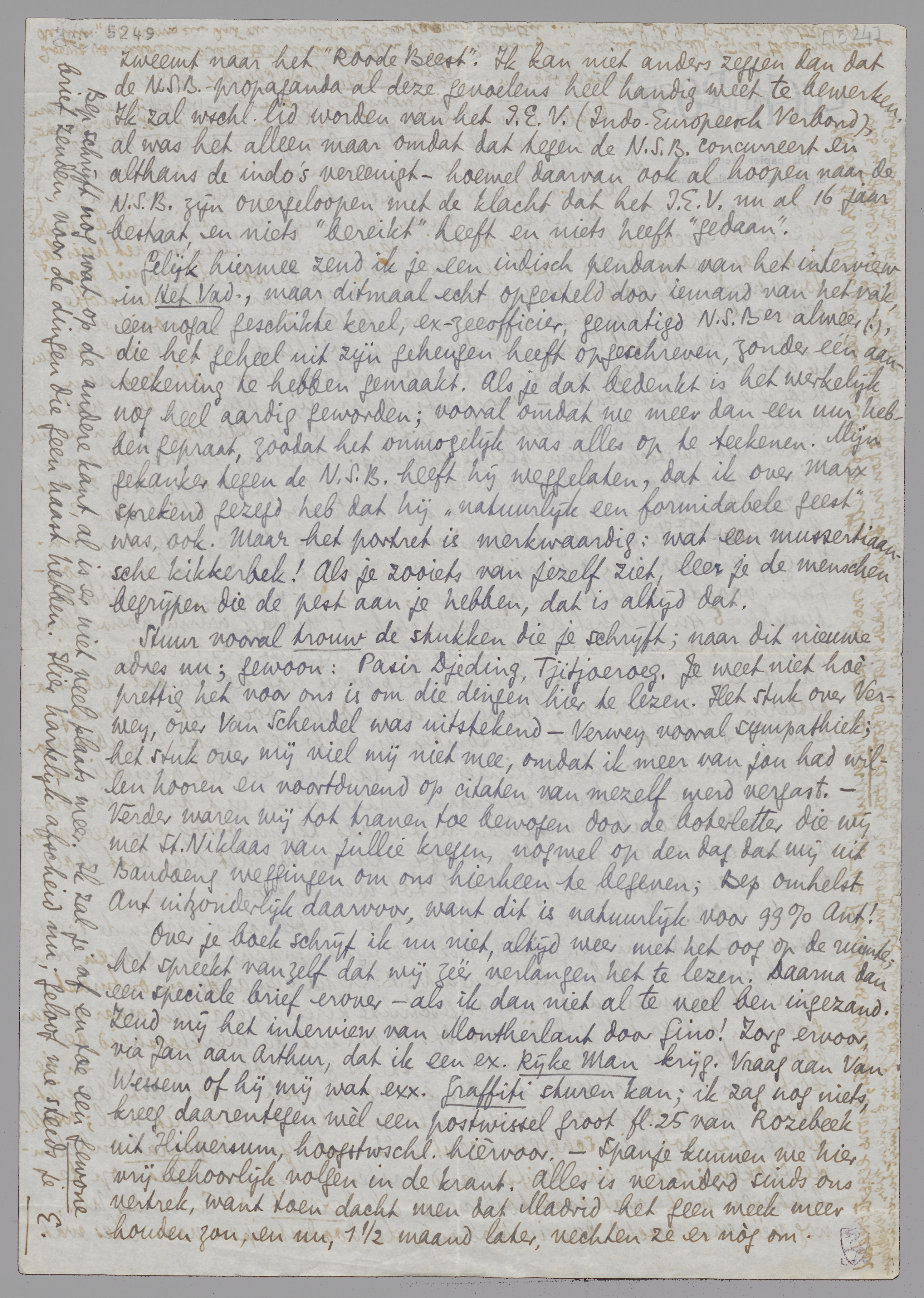 De N.S.B. tiert in Indië welig, vooral de planters hier in de Preanger, in Soekaboemi bv., vinden deze beweging prachtig en blaken van enthousiasme. Ik heb den eenen N.S.B.-er na den anderen ontmoet; over het algemeen lang geen ongeschikte kerels, die alleen maar ernaar snakken, dat er iets gedààn wordt: 1o om uit de werkloosheid te komen, de crisis in den handel, de steeds zwaardere belasting en de kortingen op salarissen, etc. Als er economisch maar wat bereikt wordt! Van procédés als in Duitschland weten ze hier niet veel; wrschl. kan het ze ook niet schelen (‘geest’ en ‘kunst’ zijn hier totaal onbekende spoken); als ze over Duitschland praten is het om elkaar op te kikkeren met ‘wat daar toch maar al bereikt is’. En verder hier, nog véél meer wschl. dan in Holland, de doodsstuipen voor alles wat zweemt naar het ‘Roode Beest’. Ik kan niet anders zeggen dan dat de N.S.B.-propaganda al deze gevoelens heel handig weet te bewerken. Ik zal wschl. lid worden van het I.E.V. (Indo-Europeesch Verbond), al was het alleen maar omdat dat tegen de N.S.B. concurreert en althans de indo's vereenigt - hoewel daarvan ook al hoopen naar de N.S.B. zijn overgeloopen met de klacht dat het I.E.V. nu al 16 jaar bestaat, en niets ‘bereikt’ heeft en niets heeft ‘gedaan’.