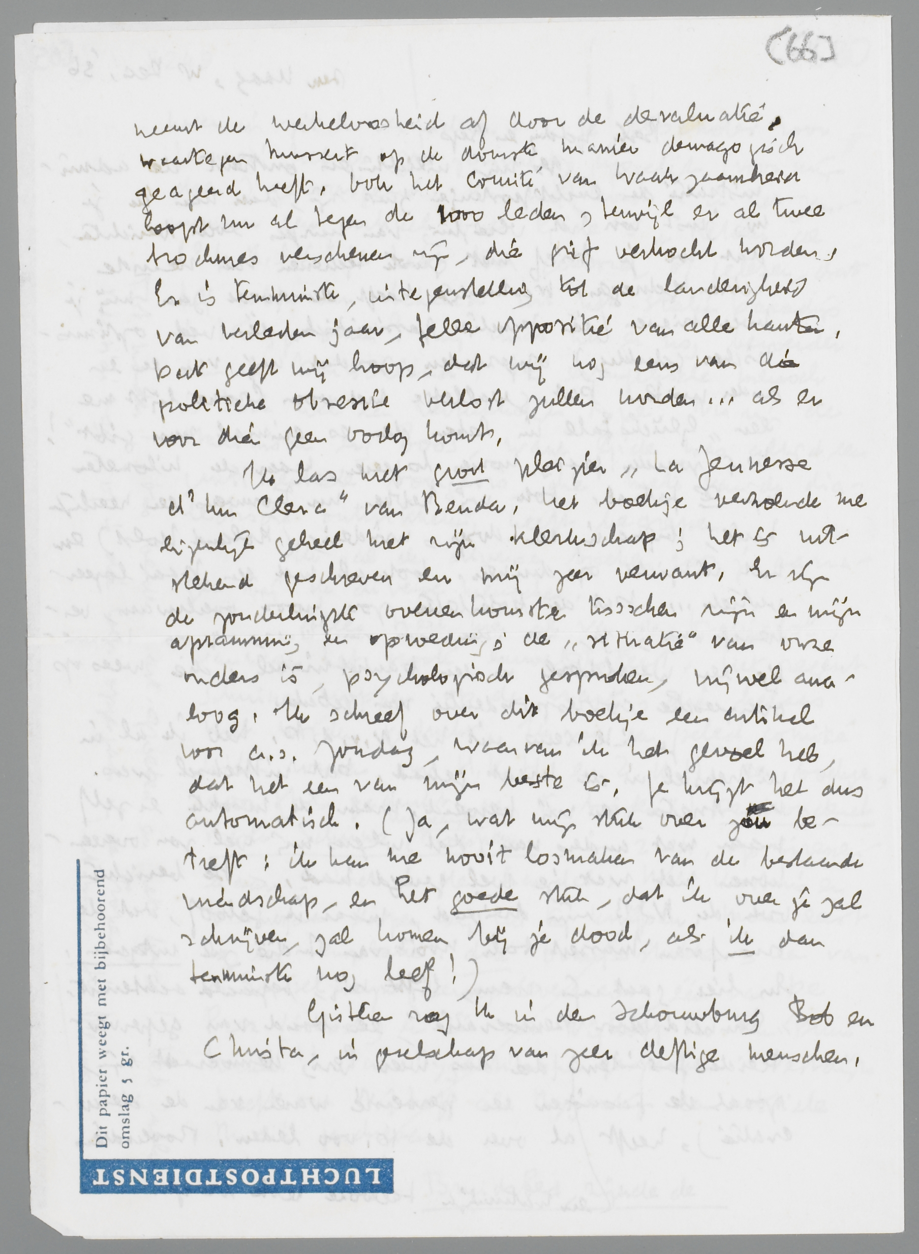 Ik las met groot pleizier La Jeunesse d'un Clerc van Benda. Het boekje verzoende me eigenlijk geheel met zijn klerkschap; het is uitstekend geschreven en mij zeer verwant. Er zijn de zonderlingste overeenkomsten tusschen zijn en mijn afstamming en opvoeding; de ‘situatie’ van onze ouders is, psychologisch gesproken, vrijwel analoog. Ik schreef over dit boekje een artikel voor a.s. Zondag, waarvan ik het gevoel heb dat het een van mijn beste is. Je krijgt het dus automatisch. (Ja, wat mijn stuk over jou betreft: ik kan me nooit losmaken van de bestaande vriendschap, en het goede stuk, dat ik over je zal schrijven, zal komen bij je dood, als ik dan tenminste nog leef!)
