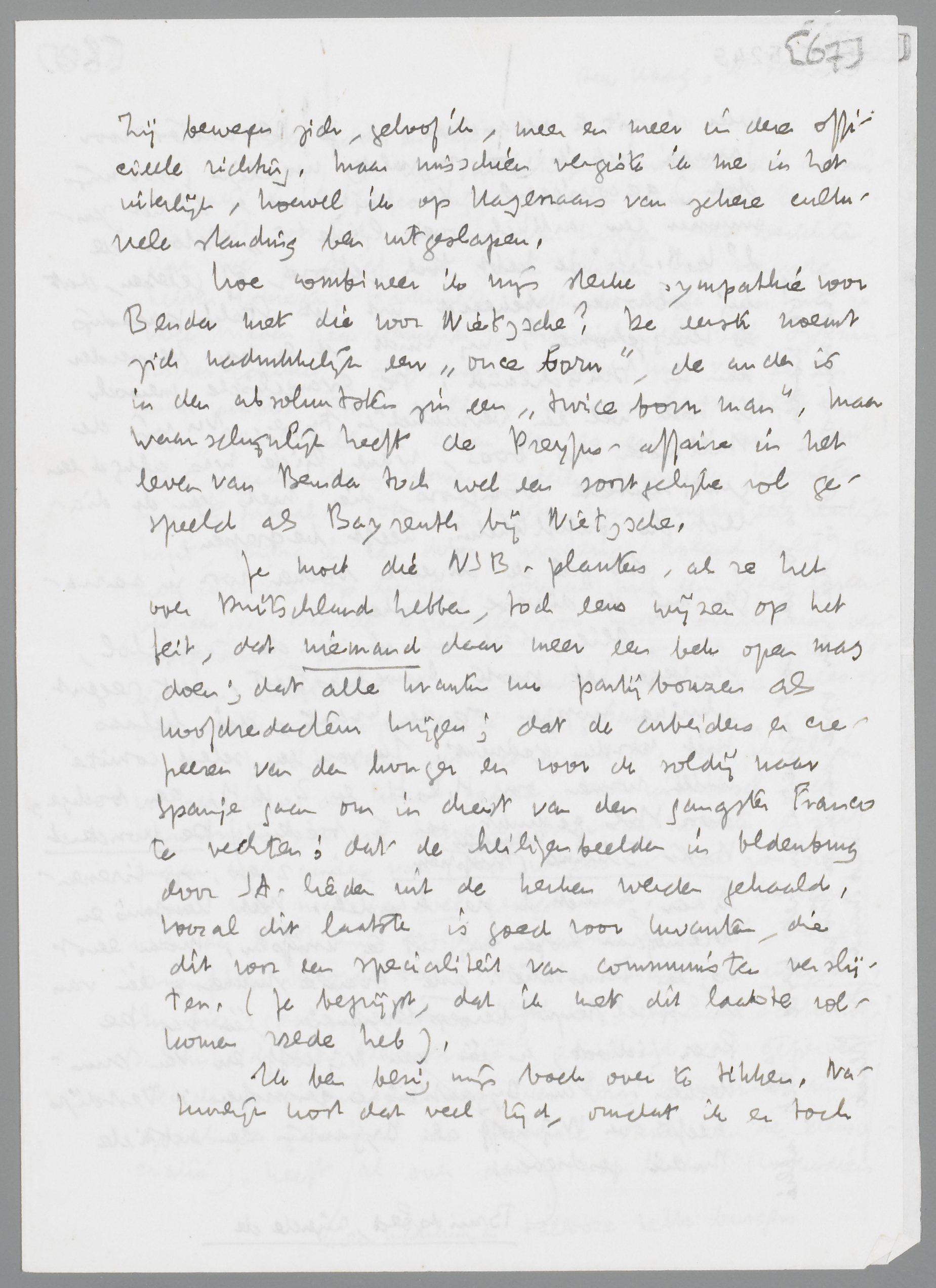 Hoe combineer ik mijn sterke sympathie voor Benda met die voor Nietzsche? De eerste noemt zich nadrukkelijk een ‘once born’, de ander is in den absoluutsten zin een ‘twice born man’, maar waarschijnlijk heeft de Dreyfus-affaire in het leven van Benda toch wel een soortgelijke rol gespeeld als Bayreuth bij Nietzsche.