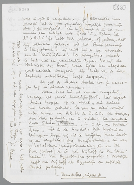 Alles tiert hier al van de oranjelol, vanwege het groote huwelijksfeest. Het regent schuine moppen op de krant, die helaas niet worden gedrukt. Ik zou een select comité willen vormen om H.K.H. en Z.K.H. een boekje, door Stols gedrukt, aan te bieden: Bruidsbed, zijnde De Honderd Beste Schuine Huwelijksmoppen, in 2 ex. op sirenen-haar, niet in den handel. Met Kerstmis en Nieuwjaar hopen wij uit te knijpen. Maar eerst nog een temptatie: drie Oranje stukken, één van v. Eysselsteyn (beroepsleverancier) één van De Prez (idioot) en één van Nijhoff en Van Duinkerken!! Van Byzantinisme gesproken; Vestdijk heeft over Nijhoff als Byzantijn een subtiele studie geschreven. Tot nader! Ons beider hart. groeten en het beste! Heb jullie Rassidi nog, of is die weer opgegaan in de tropen?