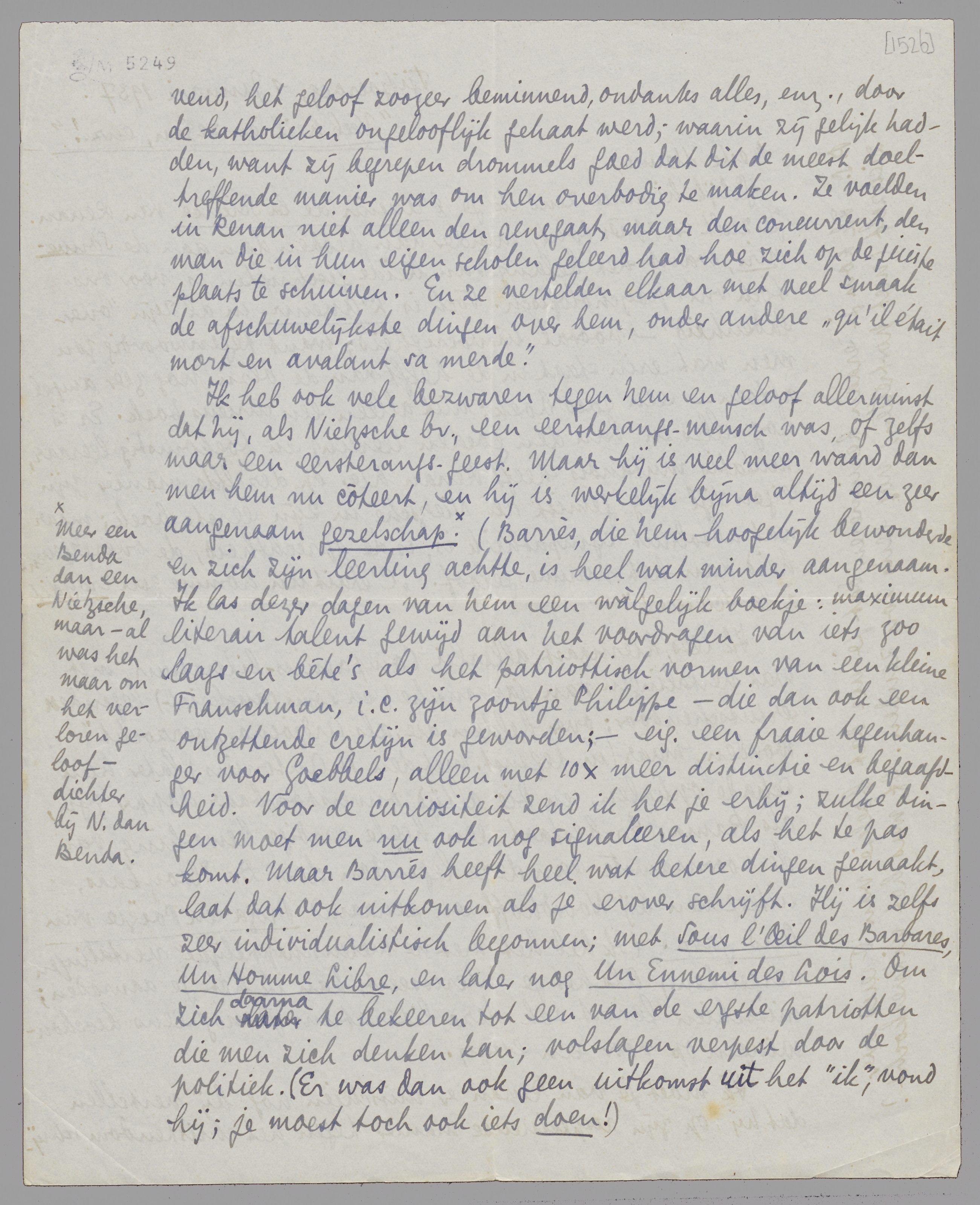 Ik heb ook vele bezwaren tegen hem en geloof allerminst dat hij, als Nietzsche bv., een eersterangs-mensch was, of zelfs maar een eersterangs-geest. Maar hij is veel meer waard dan men hem nu côteert, en hij is werkelijk bijna altijd een zeer aangenaam gezelschap. [Meer een Benda dan een Nietzsche, maar - al was het maar om het verloren geloof - dichter bij N. dan Benda.] Barrès, die hem hoogelijk bewonderde en zich zijn leerling achtte, is heel wat minder aangenaam. Ik las dezer dagen van hem een wàlgelijk boekje: maximum literair talent gewijd aan het voordragen van iets zoo laags en bête's als het patriottisch vormen van een kleine Franschman, i.c. zijn zoontje Philippe - die dan ook een ontzettende cretijn is geworden; - eig. een fraaie tegenhanger voor Goebbels, alleen met 10 × meer distinctie en begaafdheid. Voor de curiositeit zend ik het je erbij; zulke dingen moet men nu ook nog signaleeren, als het te pas komt. Maar Barrès heeft heel wat betere dingen gemaakt, laat dat ook uitkomen als je erover schrijft. Hij is zelfs zeer individualistisch begonnen; met Sous l'Oeil des Barbares, Un Homme Libre, en later nog Un Ennemi des Lois. Om zich daarna te bekeeren tot een van de ergste patriotten die men zich denken kan; volslagen verpest door de politiek. (Er was dan ook geen uitkomst uit het ‘ik’, vond hij; je moest toch ook iets doen!)