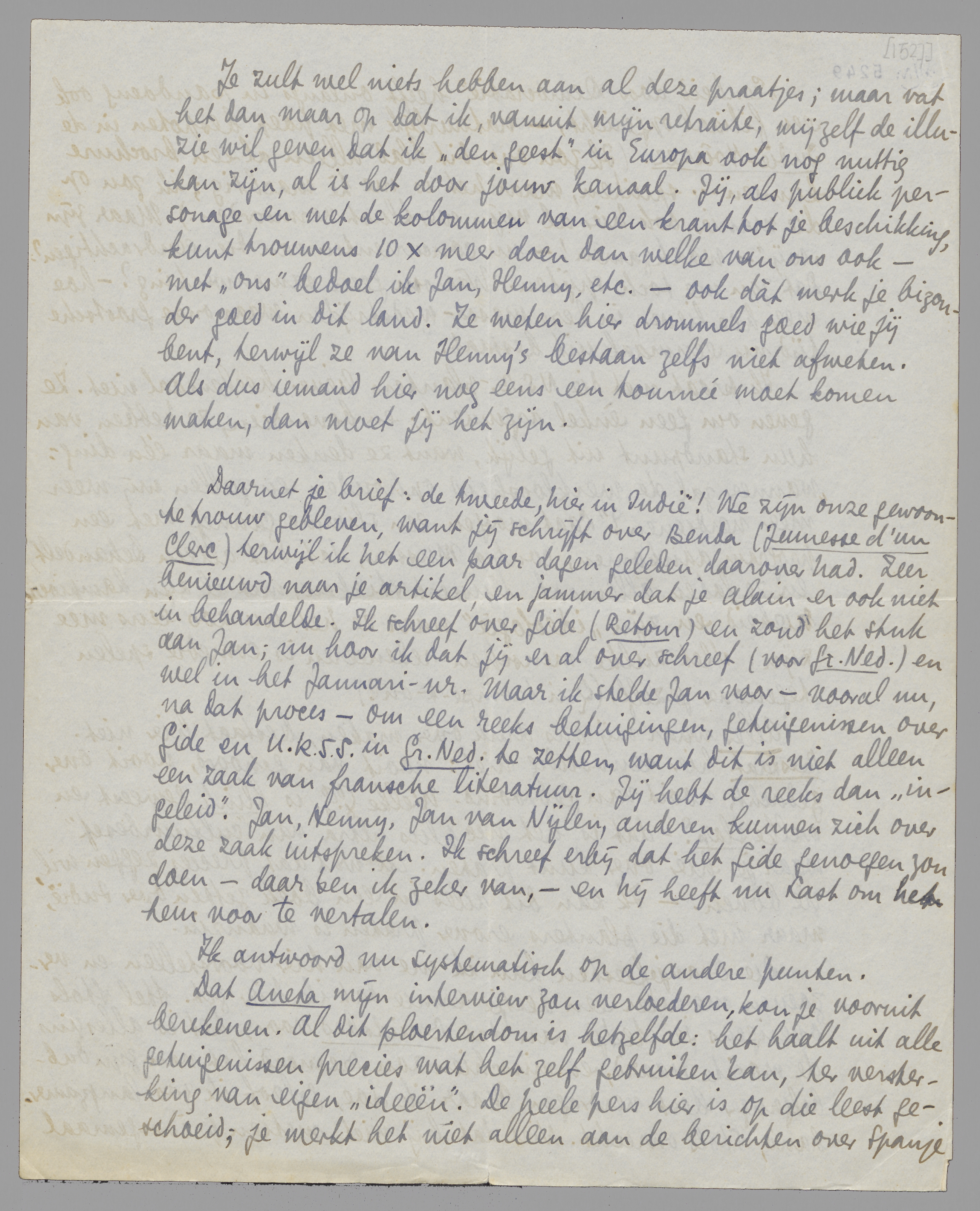 Daarnet je brief: de tweede, hier in Indië! We zijn onze gewoonte trouw gebleven, want jij schrijft over Benda (Jeunesse d'un Clerc) terwijl ik het een paar dagen geleden daarover had. Zeer benieuwd naar je artikel, en jammer dat je Alain er ook niet in behandelde. Ik schreef over Gide (Retour) en zond het stuk aan Jan; nu hoor ik dat jij er al over schreef (voor Gr. Ned.) en wel in het Januari-nr. Maar ik stelde Jan voor - vooral nu, na dat proces - om een reeks betuigingen, getuigenissen over Gide en U.R.S.S. in Gr. Ned. te zetten, want dit is niet alleen een zaak van fransche literatuur. Jij hebt de reeks dan ‘ingeleid’. Jan, Henny, Jan van Nijlen, anderen kunnen zich over deze zaak uitspreken. Ik schreef erbij dat het Gide genoegen zou doen - daar ben ik zeker van, - en hij heeft nu Last om het hem voor te vertalen.