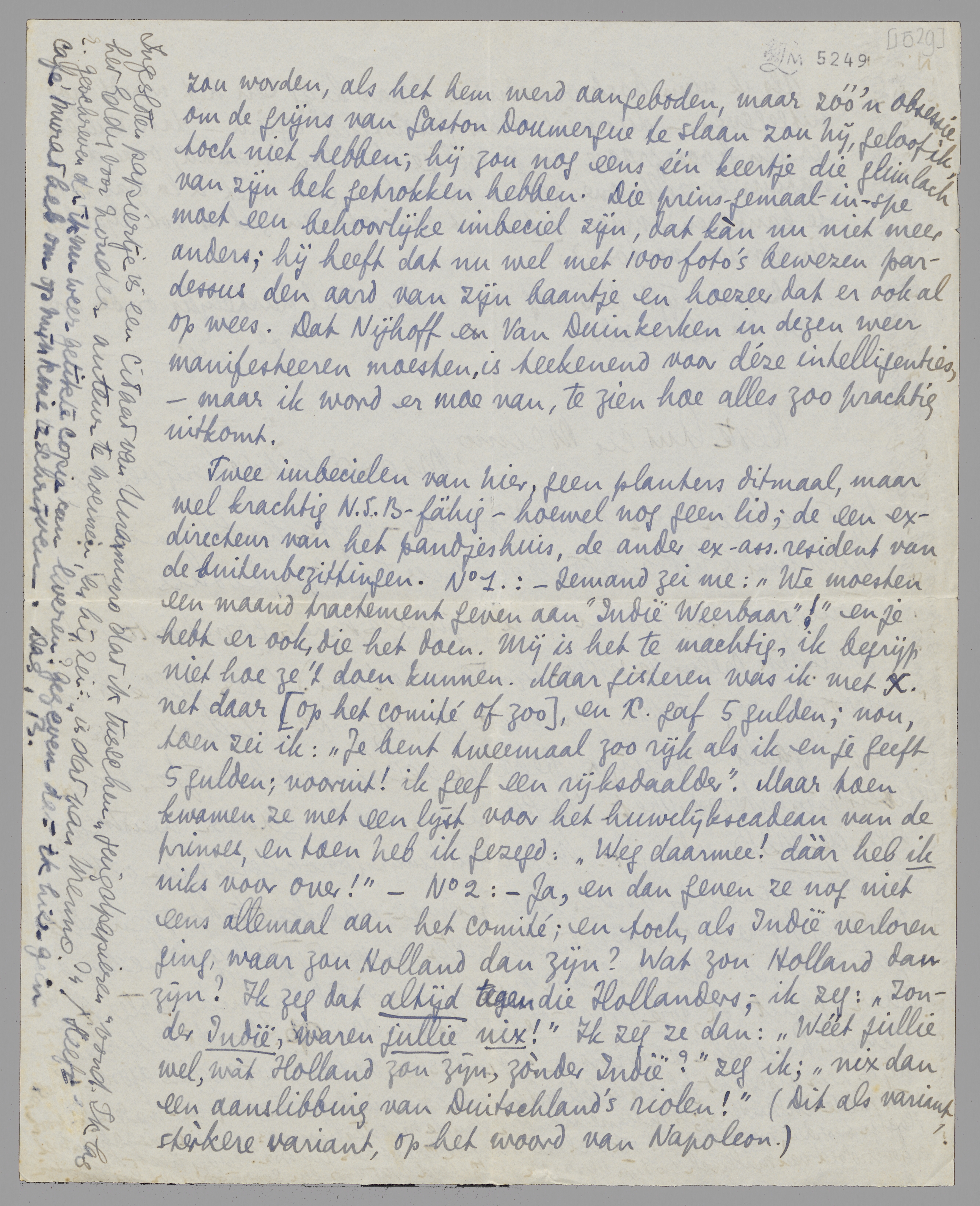 Twee imbecielen van hier, geen planters ditmaal, maar wel, krachtig N.S.B.-fähig - hoewel nog geen lid; de een ex-directeur van het pandjeshuis, de ander ex-ass. resident van de buitenbezittingen. No. 1: - Iemand zei me: ‘We moesten een maand tractement geven aan Indië Weerbaar!’ en je hebt er ook die het doen. Mij is het te machtig, ik begrijp niet hoe ze 't doen kunnen. Maar gisteren was ik met X net daar (op het comité of zoo), en X gaf 5 gulden; nou, toen zei ik: ‘Je bent tweemaal zoo rijk als ik en je geeft 5 gulden; vooruit! ik geef een rijksdaalder’. Maar toen kwamen ze met een lijst voor het huwelijkscadeau van de prinses, en toen heb ik gezegd: ‘Weg daarmee! dààr heb ik niks voor over!’ - No. 2.: - Ja, en dan geven ze nog niet eens allemaal aan het comité; en toch, als Indië verloren ging, waar zou Holland dan zijn? Wat zou Holland dan zijn? Ik zeg dat altijd tegen die Hollanders; ik zeg: ‘zonder Indië, waren jullie nix!’ Ik zeg ze dan: ‘Wéét jullie wel, wàt Holland zou zijn, zònder Indië?’ zeg ik: ‘nix dan een aanslibbing van Duitschland's riolen!’ (Dit als variant, stèrkere variant, op het woord van Napoleon.)