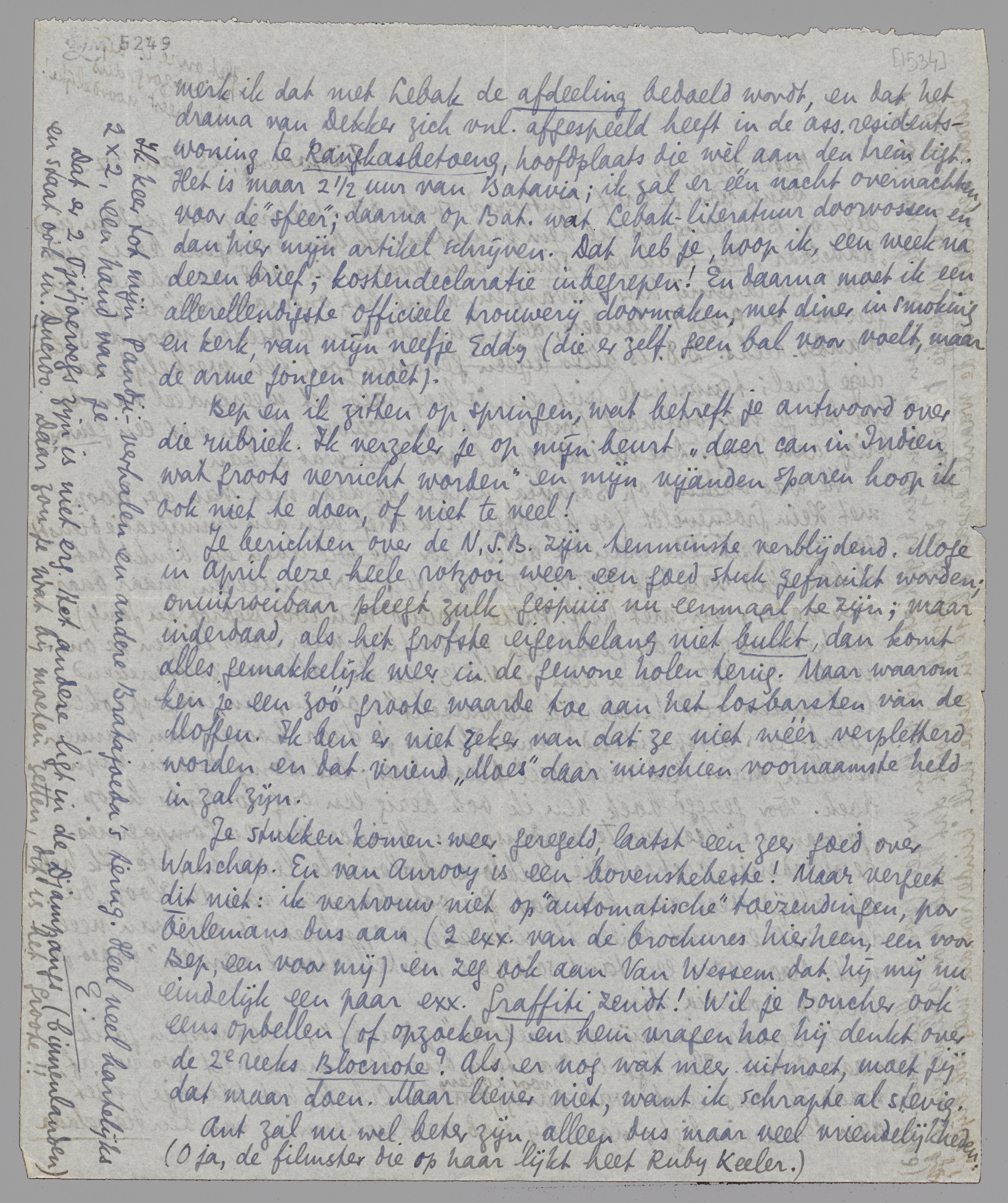 Ik ben erg in mijn sas met de ‘opdracht’; overmorgen ga ik naar Lebak. Het ligt in Bantam, dus heelemaal niet zoo ver af, maar ik was eerst wat bang voor kosten, omdat Lebak (het plaatsje) niet aan den trein ligt; maar bij nadere beschouwing van den Havelaar merk ik dat met Lebak de afdeeling bedoeld wordt, en dat het drama van Dekker zich vnl. afgespeeld heeft in de ass. residents-woning te Rangkasbetoeng, hoofdplaats die wèl aan den trein ligt. Het is maar 2 1/2 uur van Batavia; ik zal er één nacht overnachten, voor de ‘sfeer’; daarna op Bat. wat Lebak-literatuur doorvossen en dan hier mijn artikel schrijven. Dat heb je, hoop ik, een week na dezen brief; kostendeclaratie inbegrepen! En daarna moet ik een allerellendigste officieele trouwerij doormaken, met diner in smoking en kerk, van mijn neefje Eddy (die er zelf geen bal voor voelt, maar de arme jongen moèt).