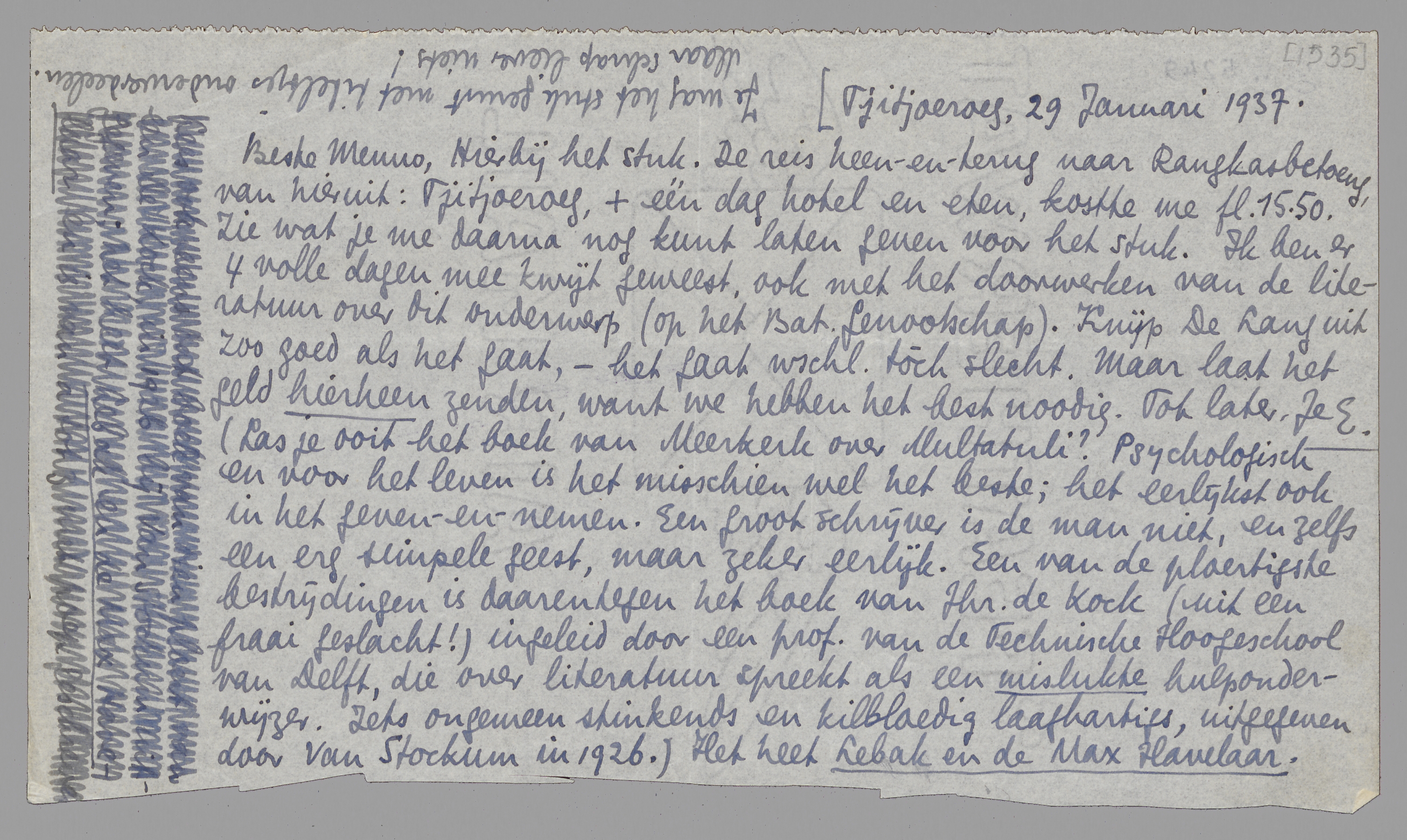 Hierbij het stuk. De reis heen-en-terug naar Rangkasbetoeng, van hieruit: Tjitjoeroeg, + één dag hotel en eten, kostte me fl. 15.50. Zie wat je me daarna nog kunt laten geven voor het stuk. Ik ben er 4 volle dagen mee kwijt geweest, ook met het doorwerken van de literatuur over dit onderwerp (op het Bat. Genootschap). Knijp De Lang uit zoo goed als het gaat, - het gaat wschl. tòch slecht. Maar laat het geld hierheen zenden, want we hebben het best noodig. Tot later. Je