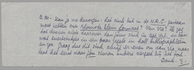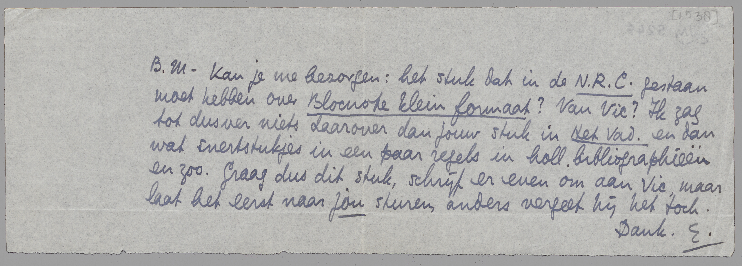 - Kan je me bezorgen: het stuk dat in de N.R.C. gestaan moet hebben over Blocnote klein formaat? Van Vic? Ik zag tot dusver niets daarover dan jouw stuk in Het Vad. en dan wat snertstukjes in een paar regels in holl. bibliographieën en zoo. Graag dus dit stuk, schrijf er even om aan Vic, maar laat het eerst naar jou sturen, anders vergeet hij het toch.