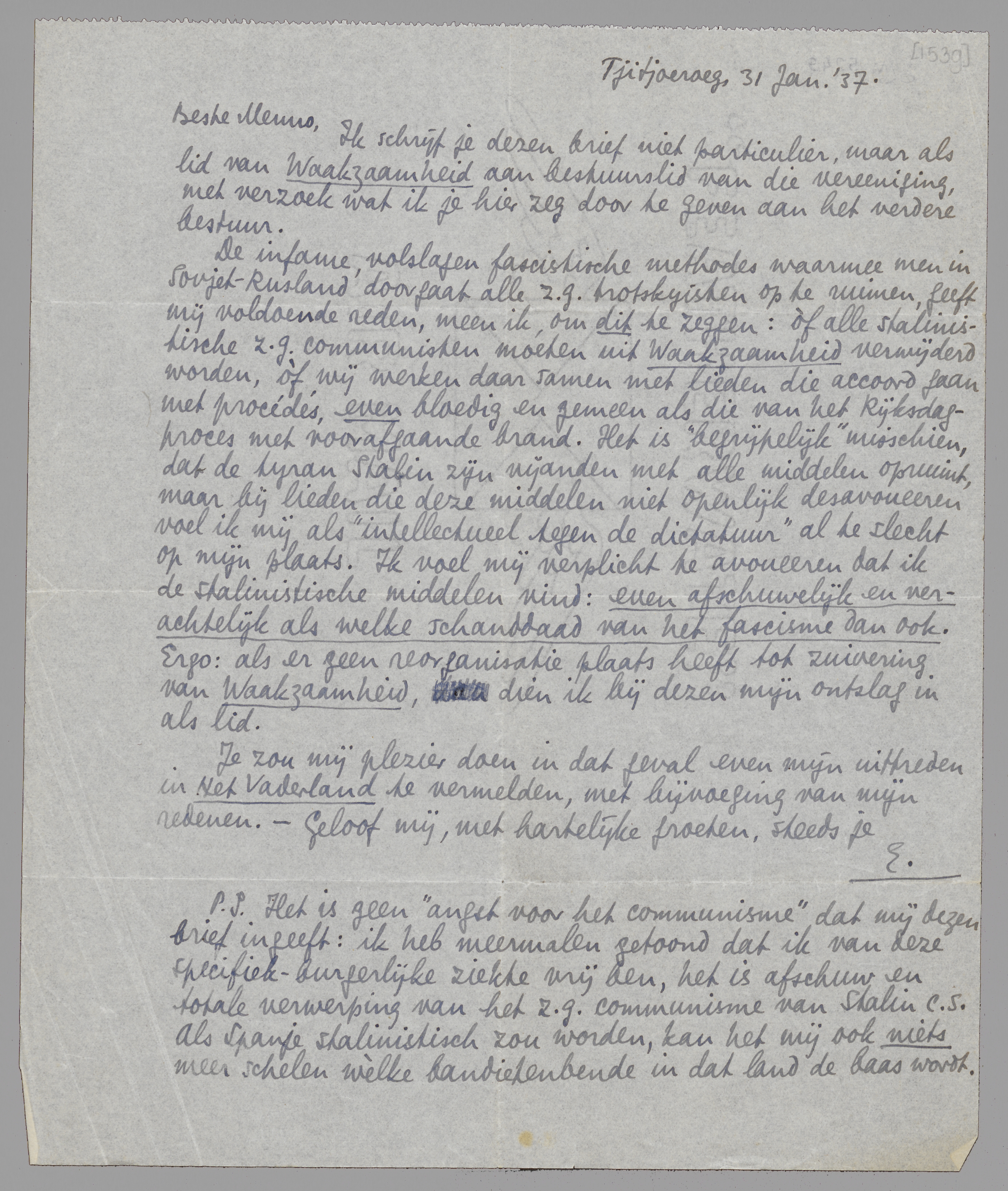 De infame, volslagen fascistische methodes waarmee men in Sovjet-Rusland doorgaat alle z.g. trotskyisten op te ruimen, geeft mij voldoende reden, meen ik, om dit te zeggen: òf alle stalinistische z.g. communisten moeten uit Waakzaamheid verwijderd worden, òf wij werken daar samen met lieden die accoord gaan met procédés, even bloedig en gemeen als die van het Rijksdagproces met voorafgaande brand. Het is ‘begrijpelijk’ misschien, dat de tyran Stalin zijn vijanden met alle middelen opruimt, maar bij lieden die deze middelen niet openlijk desavoueeren voel ik mij als ‘intellectueel tegen de dictatuur’ al te slecht op mijn plaats. Ik voel mij verplicht te avoueeren dat ik de stalinistische middelen vind: even afschuwelijk en verachtelijk als welke schanddaad van het fascisme dan ook. Ergo: als er geen reorganisatie plaats heeft tot zuivering van Waakzaamheid, dien ik bij dezen mijn ontslag in als lid.