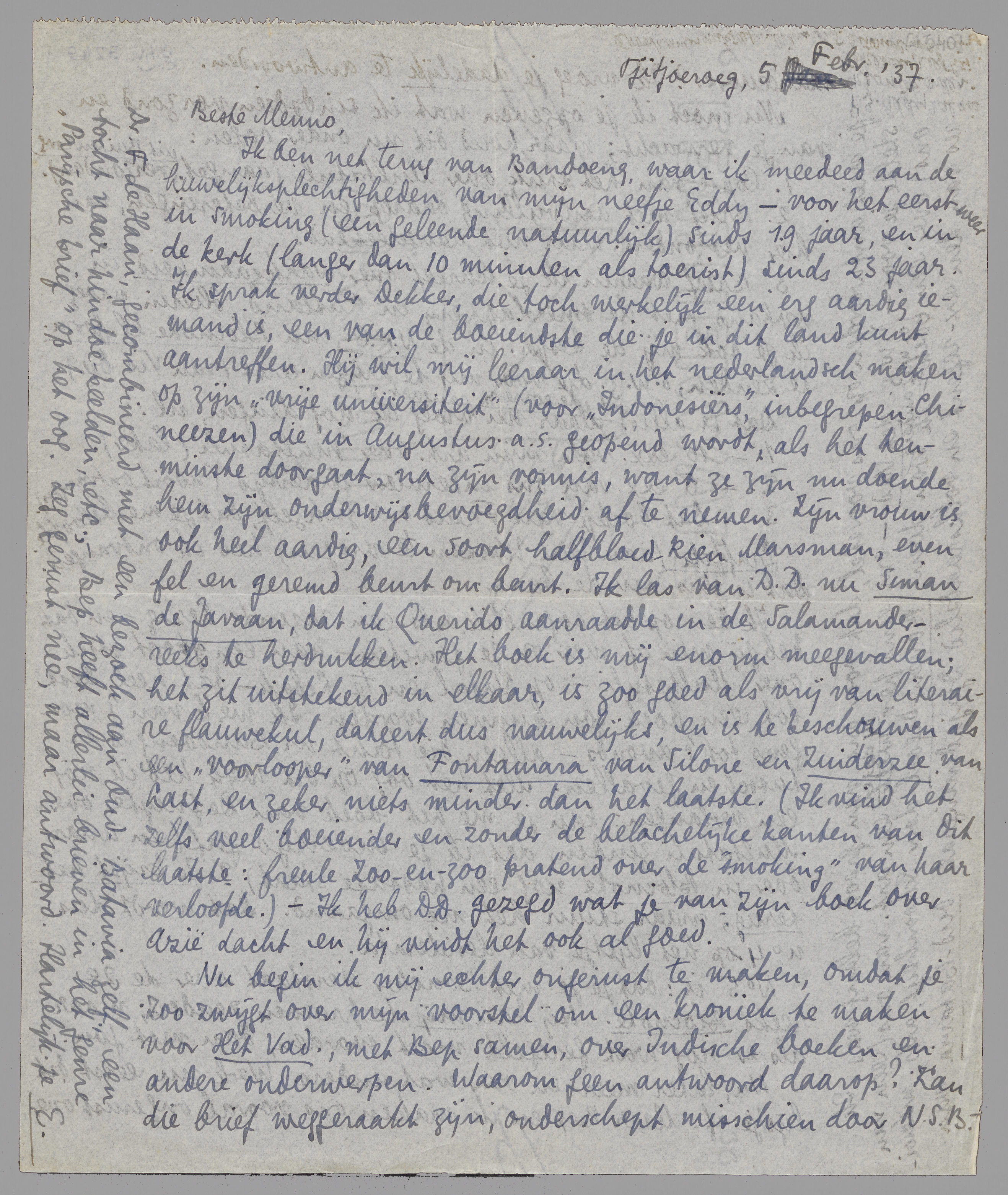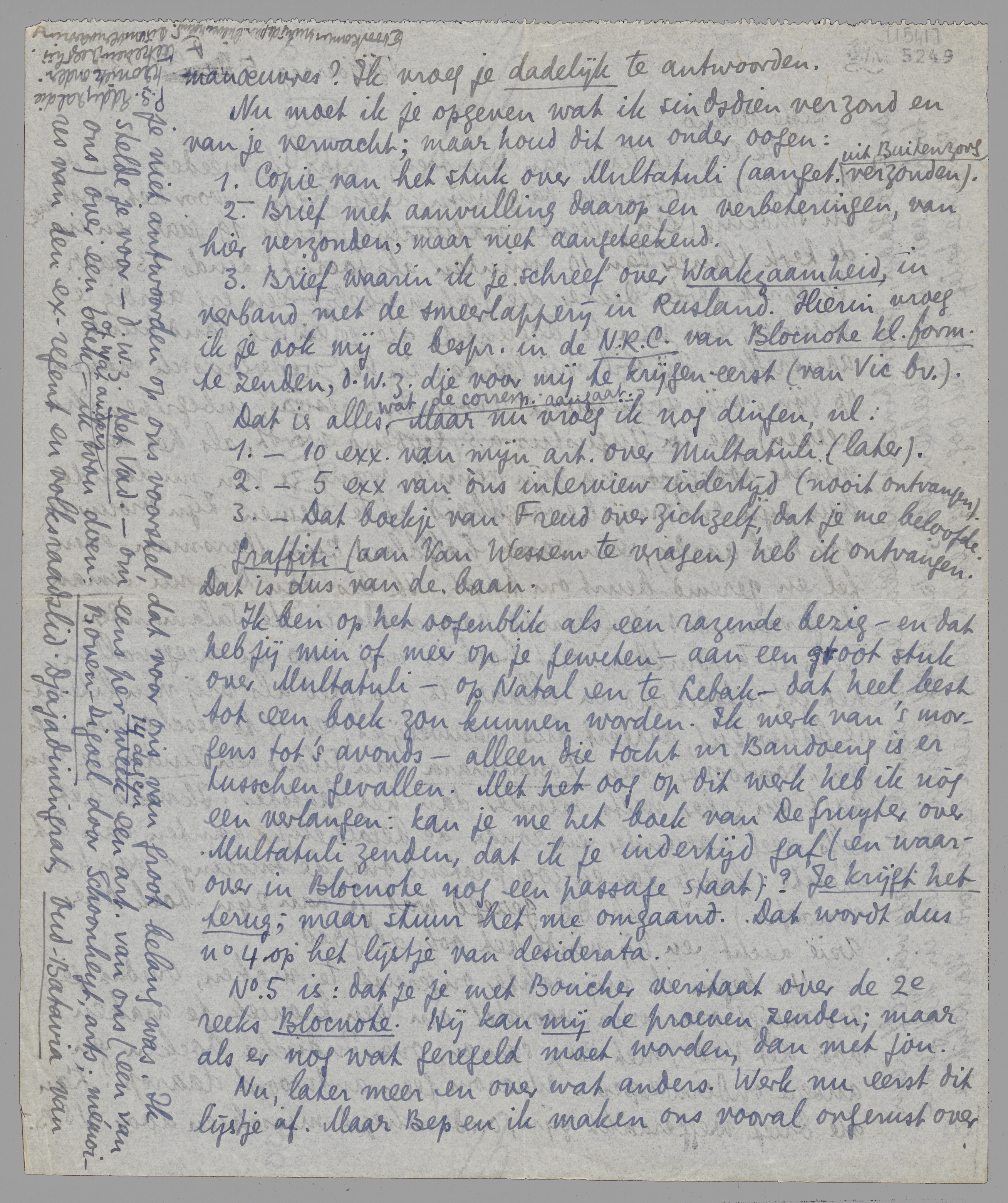 Ik ben op het oogenblik als een razende bezig - en dat heb jij min of meer op je geweten - aan een groot stuk over Multatuli - op Natal en te Lebak - dat heel best tot een boek zou kunnen worden. Ik werk van 's morgens tot 's avonds - alleen die tocht nr Bandoeng is er tusschen gevallen. Met het oog op dit werk heb ik nòg een verlangen: kan je me het boek van De Gruyter over Multatuli zenden, dat ik je indertijd gaf (en waarover in Blocnote nog een passage staat)? Je krijgt het terug; maar stuur het me omgaand. Dat wordt dus no. 4 op het lijstje van desiderata.