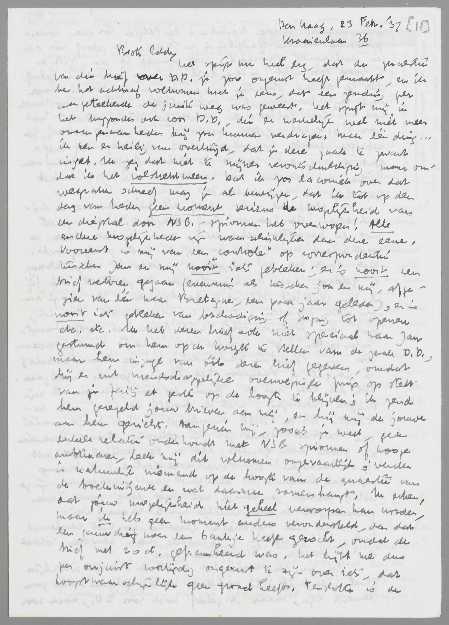 Nogmaals, ik schrijf dit niet om me te disculpeeren. Ik heb den brief over D.D. in het geheel niet en bagatelle behandeld, maar ik heb alleen de mogelijkheid van spionnage bij de post gering geacht. Dat spijt me nu ontzettend, maar ik weiger alsnog te gelooven aan de hypothetische mogelijkheid, die jij als een realiteit schijnt te beschouwen. Ik zou je dan ook sterk afraden, D.D. te verontrusten door iets, dat hem waarschijnlijk niet boven het hoofd hangt. Interpreteer niet, voordat er werkelijk ernstige redenen voor zijn, Indische verhoudingen in de Nederlandsche: je vergalt je daardoor het leven, zonder noodzaak. Ook dit weer niet als ‘flauw excuus’, maar als mijn diepste overtuiging, wat de portée van de zaak betreft. Als de brief onverhoopt in het hoofdkwartier van Mussert terecht zou zijn gekomen, was er bovendien al groote kans geweest, dat er een artikel met ‘onthullingen’ in Vova had gestaan. Kieskeurig zijn die lieden n.l. allerminst, en onbeheerscht zijn ze ook, zoodat ze heusch wel niet lang zouden hebben gewacht, als er een relletje uit te maken was.