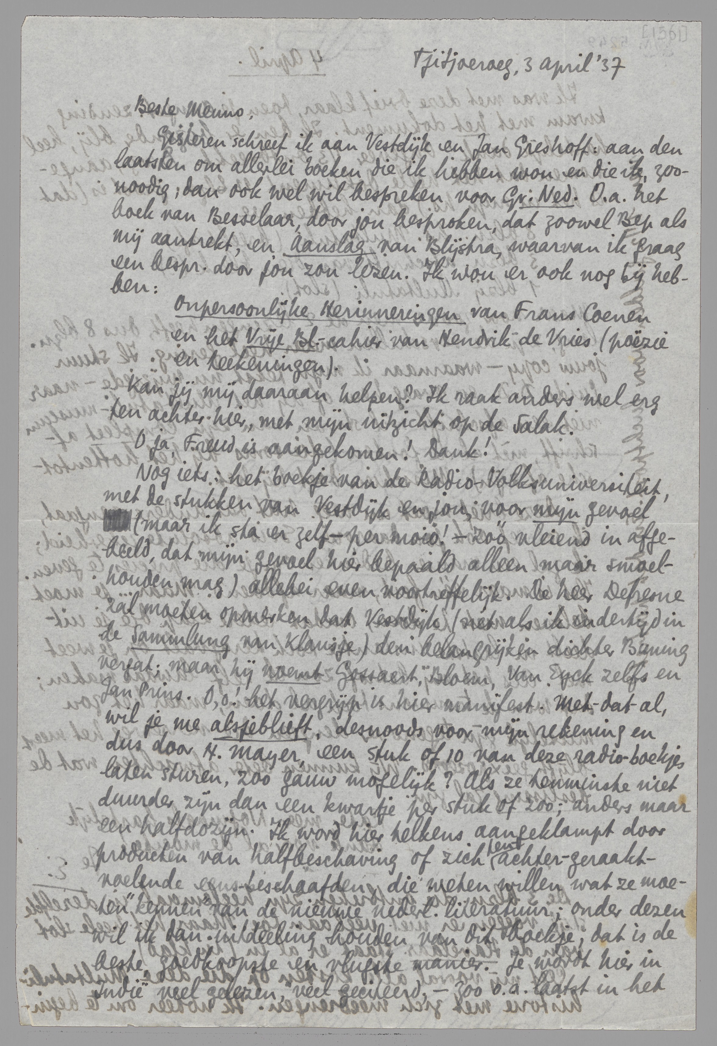 Gisteren schreef ik aan Vestdijk en Jan Greshoff: aan den laatsten om allerlei boeken die ik hebben wou en die ik, zoonoodig, dan ook wel wil bespreken voor Gr. Ned. O.a. het boek van Besselaar, door jou besproken, dat zoowel Bep als mij aantrekt, en Aanslag van Blijstra, waarvan ik graag een bespr. door jou zou lezen. Ik wou er ook nog bij hebben: Onpersoonlijke Herinneringen van Frans Coenen en het Vrije Bl.-cahier van Hendrik de Vries (poëzie en teekeningen).